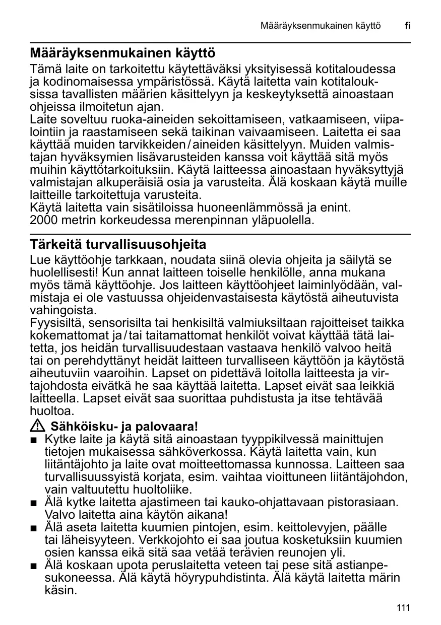Kassera förpackningen på ett miljövänligt sätt. Denna enhet är märkt i enlighet med der europeiska direktivet 2012/19/EU om avfall som utgörs av eller innehåller elektroniska produkter (waste electrical and electronic equipment – WEEE). Direktivet anger ramarna för inom EU giltigt återtagande och korrekt återvinning av uttjänta enheter. Kontakta din fackhandel om du vill ha ytterligare information. Konsumentbestämmelser I Sverige gäller av EHL antagna konsumentbestämmelser. Den fullständiga texten inns hos din handlare. Spar kvittot. Rätt till ändringar förbehålls. Määräyksenmukainen käyttö Määräyksenmukainen käyttö Tämä laite on tarkoitettu käytettäväksi yksityisessä kotitaloudessa ja kodinomaisessa ympäristössä. Käytä laitetta vain kotitalouksissa tavallisten määrien käsittelyyn ja keskeytyksettä ainoastaan ohjeissa ilmoitetun ajan. Laite soveltuu ruoka-aineiden sekoittamiseen, vatkaamiseen, viipalointiin ja raastamiseen sekä taikinan vaivaamiseen. Laitetta ei saa käyttää muiden tarvikkeiden / aineiden käsittelyyn. Muiden valmistajan hyväksymien lisävarusteiden kanssa voit käyttää sitä myös muihin käyttötarkoituksiin. Käytä laitteessa ainoastaan hyväksyttyjä valmistajan alkuperäisiä osia ja varusteita. Älä koskaan käytä muille laitteille tarkoitettuja varusteita. Käytä laitetta vain sisätiloissa huoneenlämmössä ja enint. 2000 metrin korkeudessa merenpinnan yläpuolella. Tärkeitä turvallisuusohjeita Lue käyttöohje tarkkaan, noudata siinä olevia ohjeita ja säilytä se huolellisesti! Kun annat laitteen toiselle henkilölle, anna mukana myös tämä käyttöohje. Jos laitteen käyttöohjeet laiminlyödään, valmistaja ei ole vastuussa ohjeidenvastaisesta käytöstä aiheutuvista vahingoista. Fyysisiltä, sensorisilta tai henkisiltä valmiuksiltaan rajoitteiset taikka kokemattomat ja / tai taitamattomat henkilöt voivat käyttää tätä laitetta, jos heidän turvallisuudestaan vastaava henkilö valvoo heitä tai on perehdyttänyt heidät laitteen turvalliseen käyttöön ja käytöstä aiheutuviin vaaroihin. Lapset on pidettävä loitolla laitteesta ja virtajohdosta eivätkä he saa käyttää laitetta. Lapset eivät saa leikkiä laitteella. Lapset eivät saa suorittaa puhdistusta ja itse tehtävää huoltoa. W Sähköisku- ja palovaara! ■ Kytke laite ja käytä sitä ainoastaan tyyppikilvessä mainittujen tietojen mukaisessa sähköverkossa. Käytä laitetta vain, kun liitäntäjohto ja laite ovat moitteettomassa kunnossa. Laitteen saa turvallisuussyistä korjata, esim. vaihtaa vioittuneen liitäntäjohdon, vain valtuutettu huoltoliike. ■ Älä kytke laitetta ajastimeen tai kauko-ohjattavaan pistorasiaan. Valvo laitetta aina käytön aikana! ■ Älä aseta laitetta kuumien pintojen, esim. keittolevyjen, päälle tai läheisyyteen. Verkkojohto ei saa joutua kosketuksiin kuumien osien kanssa eikä sitä saa vetää terävien reunojen yli. ■ Älä koskaan upota peruslaitetta veteen tai pese sitä astianpesukoneessa. Älä käytä höyrypuhdistinta. Älä käytä laitetta märin käsin.