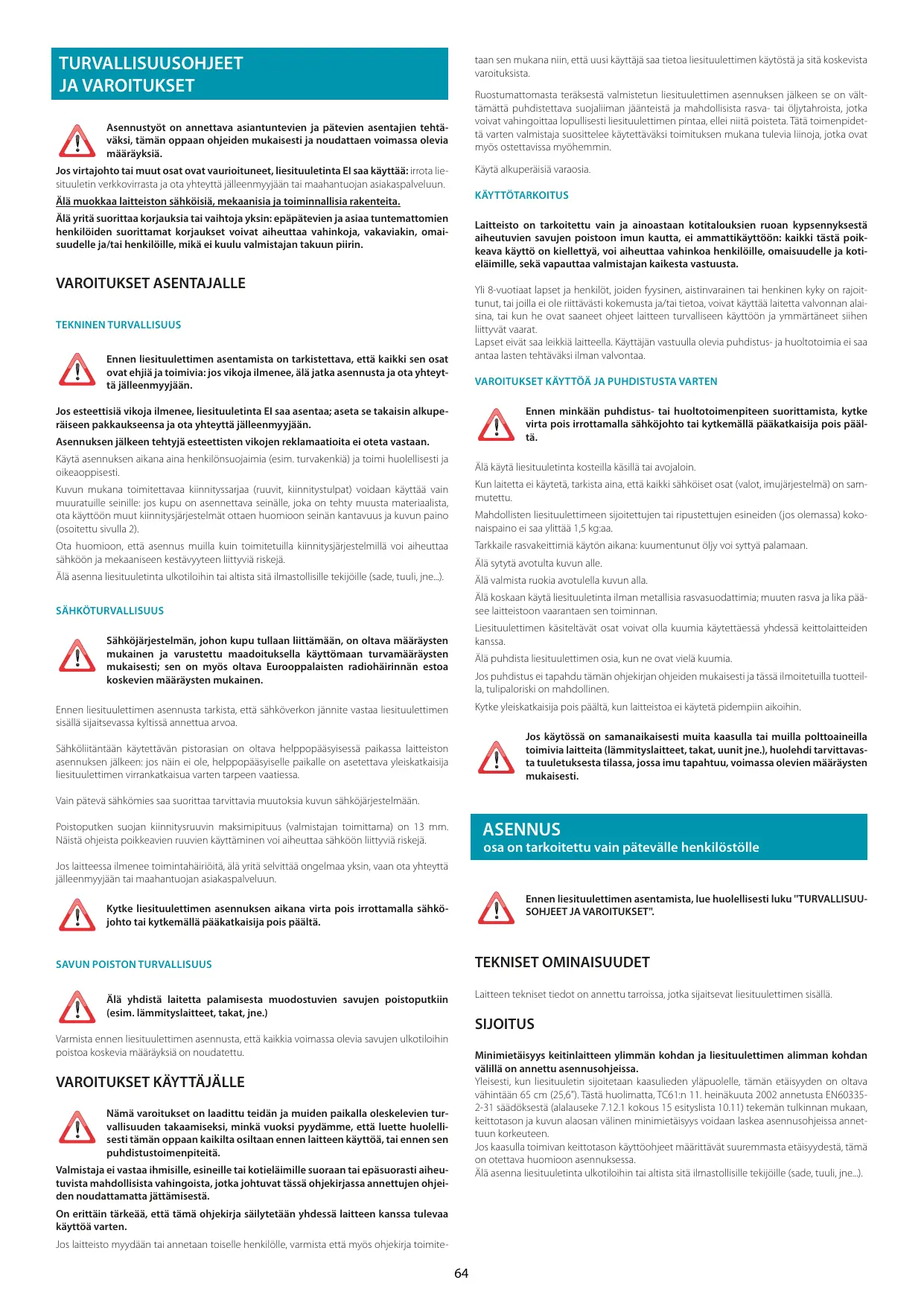 Nämä varoitukset on laadittu teidän ja muiden paikalla oleskelevien turvallisuuden takaamiseksi, minkä vuoksi pyydämme, että luette huolellisesti tämän oppaan kaikilta osiltaan ennen laitteen käyttöä, tai ennen sen puhdistustoimenpiteitä. Valmistaja ei vastaa ihmisille, esineille tai kotieläimille suoraan tai epäsuorasti aiheutuvista mahdollisista vahingoista, jotka johtuvat tässä ohjekirjassa annettujen ohjeiden noudattamatta jättämisestä. On erittäin tärkeää, että tämä ohjekirja säilytetään yhdessä laitteen kanssa tulevaa käyttöä varten. Jos laitteisto myydään tai annetaan toiselle henkilölle, varmista että myös ohjekirja toimite-
