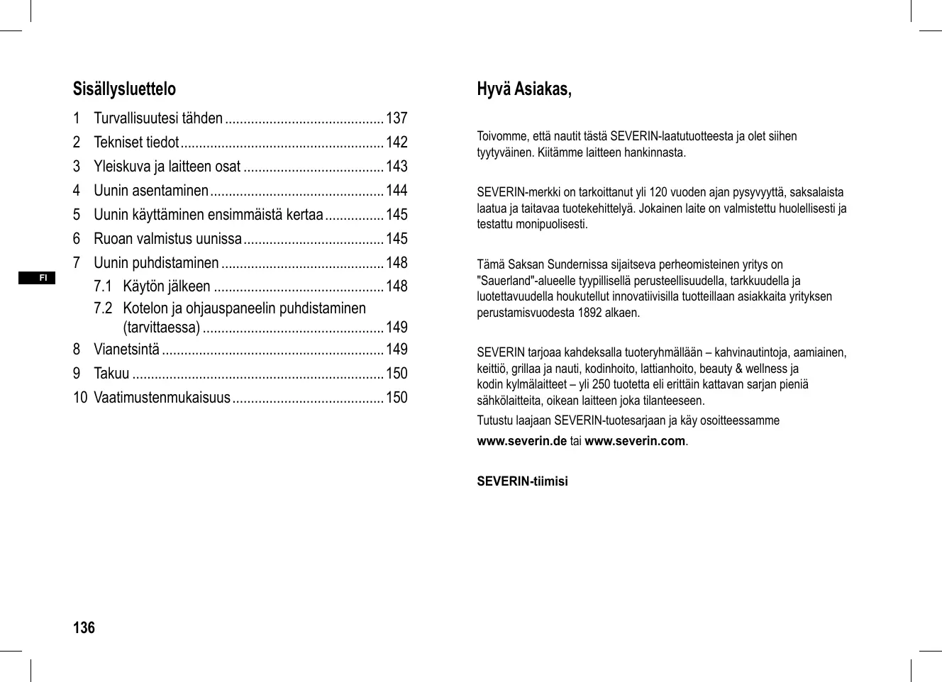 - 10 Vaatimustenmukaisuus Hyvä Asiakas, Toivomme, että nautit tästä SEVERIN-laatutuotteesta ja olet siihen tyytyväinen. Kiitämme laitteen hankinnasta. SEVERIN-merkki on tarkoittanut yli 120 vuoden ajan pysyvyyttä, saksalaista laatua ja taitavaa tuotekehittelyä. Jokainen laite on valmistettu huolellisesti ja testattu monipuolisesti. Tämä Saksan Sundernissa sijaitseva perheomisteinen yritys on "Sauerland"-alueelle tyypillisellä perusteellisuudella, tarkkuudella ja luotettavuudella houkutellut innovatiivisilla tuotteillaan asiakkaita yrityksen perustamisvuodesta 1892 alkaen. SEVERIN tarjoaa kahdeksalla tuoteryhmällään – kahvinautintoja, aamiainen, keittiö, grillaa ja nauti, kodinhoito, lattianhoito, beauty & wellness ja kodin kylmälaitteet – yli 250 tuotetta eli erittäin kattavan sarjan pieniä sähkölaitteita, oikean laitteen joka tilanteeseen. Tutustu laajaan SEVERIN-tuotesarjaan ja käy osoitteessamme www.severin.de tai www.severin.com. SEVERIN-tiimisi p. 150