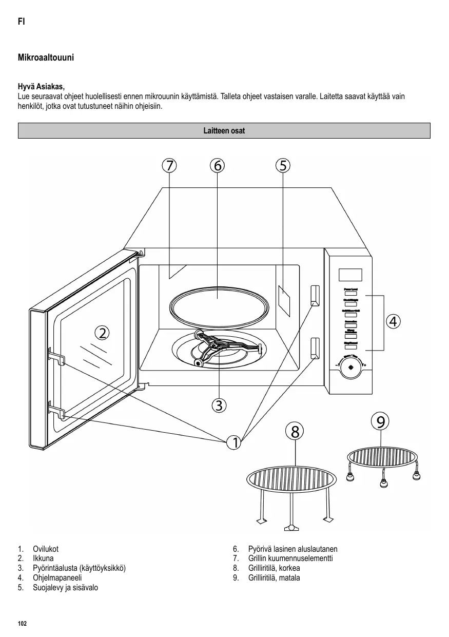 Mikroaaltouuni Hyvä Asiakas, Lue seuraavat ohjeet huolellisesti ennen mikrouunin käyttämistä. Talleta ohjeet vastaisen varalle. Laitetta saavat käyttää vain henkilöt, jotka ovat tutustuneet näihin ohjeisiin. Laitteen osat
