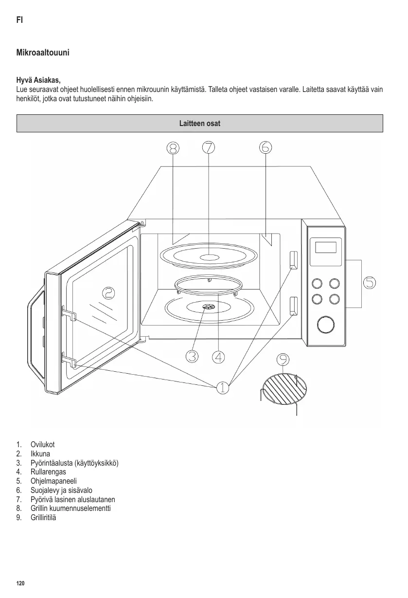 FI Mikroaaltouuni Hyvä Asiakas, Lue seuraavat ohjeet huolellisesti ennen mikrouunin käyttämistä. Talleta ohjeet vastaisen varalle. Laitetta saavat käyttää vain henkilöt, jotka ovat tutustuneet näihin ohjeisiin. Laitteen osat