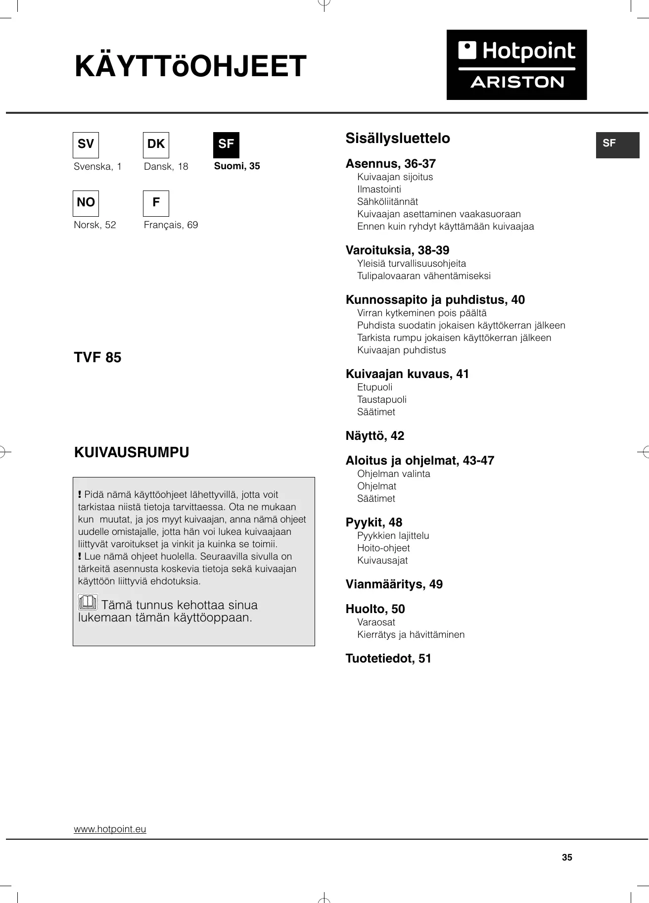 KÄYTTÖOHJE FTVF85CPSK HOTPOINT