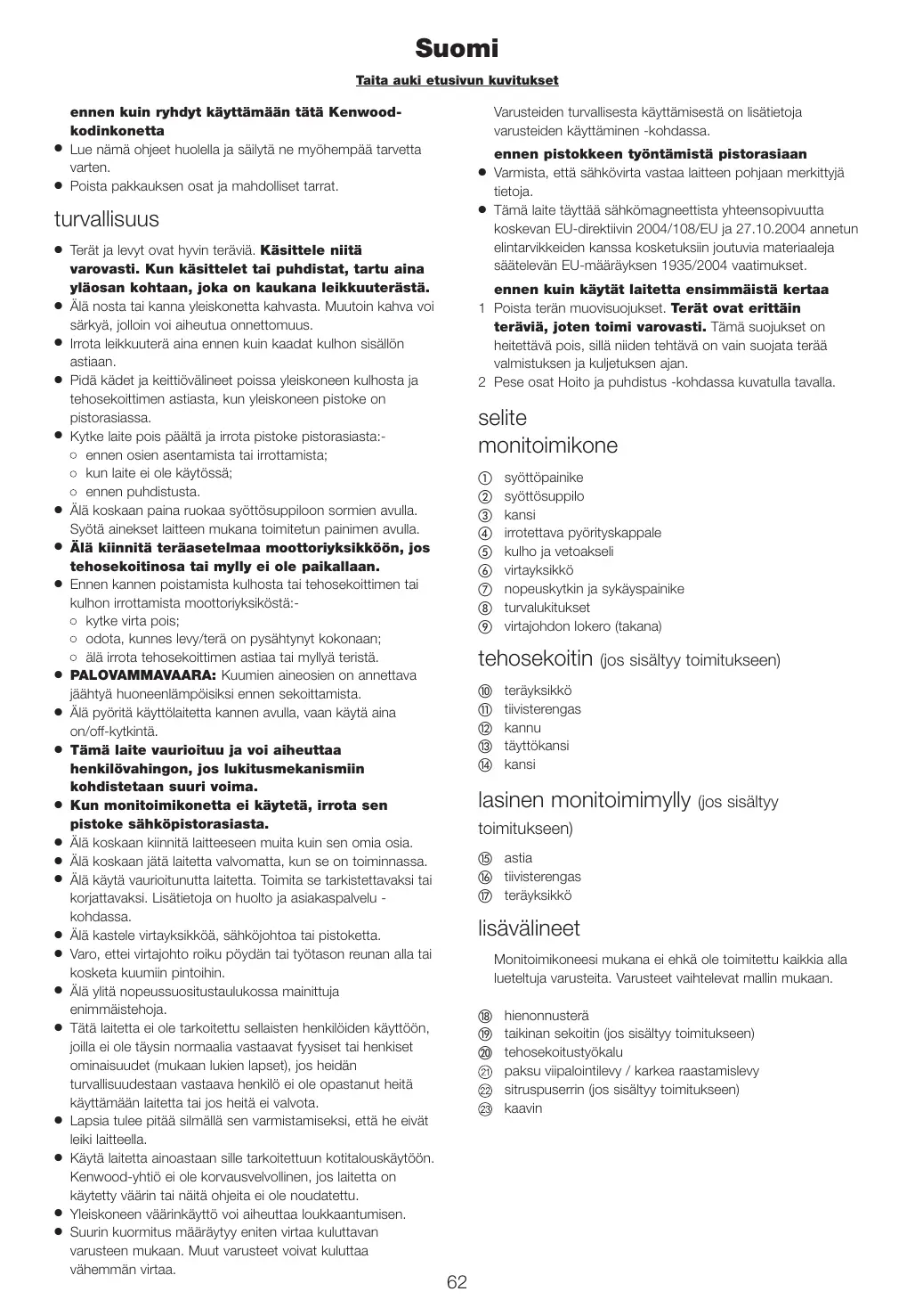 Une mauvaise utilisation de votre robot / mixeur peut provoquer des blessures. Le chiffre maximum est basé sur l’accessoire qui utilise la plus grande charge d’énergie. D’autres accessoires peuvent demander moins d’énergie. Référez-vous à la section pertinente du chapitre « utilisation des accessoires » pour consulter d’autres avertissements relatifs à la sécurité de chaque accessoire.