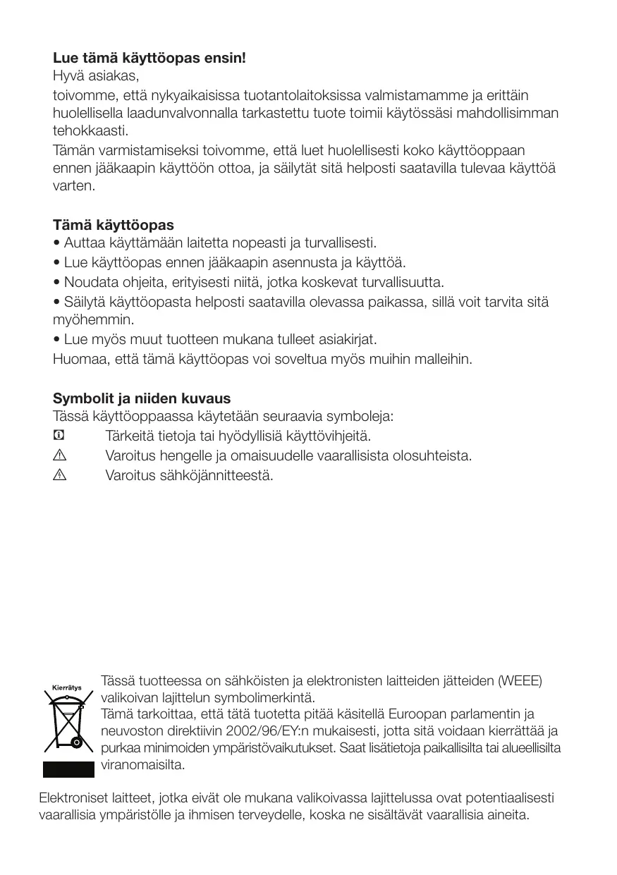 NO Lue tämä käyttöopas ensin! Hyvä asiakas, toivomme, että nykyaikaisissa tuotantolaitoksissa valmistamamme ja erittäin huolellisella laadunvalvonnalla tarkastettu tuote toimii käytössäsi mahdollisimman tehokkaasti. Tämän varmistamiseksi toivomme, että luet huolellisesti koko käyttöoppaan ennen jääkaapin käyttöön ottoa, ja säilytät sitä helposti saatavilla tulevaa käyttöä varten. Tämä käyttöopas • Auttaa käyttämään laitetta nopeasti ja turvallisesti. • Lue käyttöopas ennen jääkaapin asennusta ja käyttöä. • Noudata ohjeita, erityisesti niitä, jotka koskevat turvallisuutta. • Säilytä käyttöopasta helposti saatavilla olevassa paikassa, sillä voit tarvita sitä myöhemmin. • Lue myös muut tuotteen mukana tulleet asiakirjat. Huomaa, että tämä käyttöopas voi soveltua myös muihin malleihin. Symbolit ja niiden kuvaus Tässä käyttöoppaassa käytetään seuraavia symboleja: C Tärkeitä tietoja tai hyödyllisiä käyttövihjeitä. A Varoitus hengelle ja omaisuudelle vaarallisista olosuhteista. B Varoitus sähköjännitteestä.