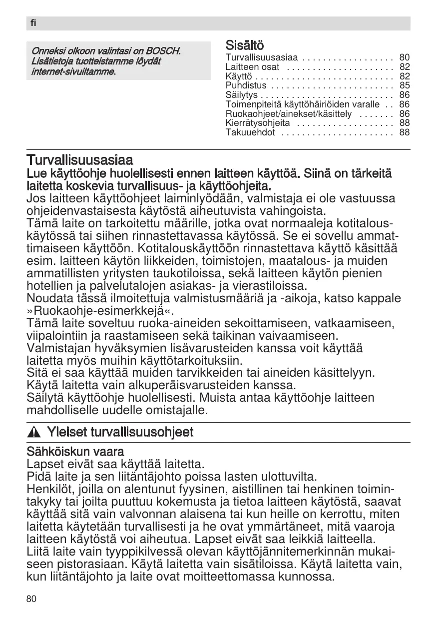 Lue käyttöohje huolellisesti ennen laitteen käyttöä. Siinä on tärkeitä laitetta koskevia turvallisuus- ja käyttöohjeita. Jos laitteen käyttöohjeet laiminlyödään, valmistaja ei ole vastuussa ohjeidenvastaisesta käytöstä aiheutuvista vahingoista. Tämä laite on tarkoitettu määrille, jotka ovat normaaleja kotitalouskäytössä tai siihen rinnastettavassa käytössä. Se ei sovellu ammattimaiseen käyttöön. Kotitalouskäyttöön rinnastettava käyttö käsittää esim. laitteen käytön liikkeiden, toimistojen, maatalous- ja muiden ammatillisten yritysten taukotiloissa, sekä laitteen käytön pienien hotellien ja palvelutalojen asiakas- ja vierastiloissa. Noudata tässä ilmoitettuja valmistusmääriä ja -aikoja, katso kappale »Ruokaohje-esimerkkejä«. Tämä laite soveltuu ruoka-aineiden sekoittamiseen, vatkaamiseen, viipalointiin ja raastamiseen sekä taikinan vaivaamiseen. Valmistajan hyväksymien lisävarusteiden kanssa voit käyttää laitetta myös muihin käyttötarkoituksiin. Sitä ei saa käyttää muiden tarvikkeiden tai aineiden käsittelyyn. Käytä laitetta vain alkuperäisvarusteiden kanssa. Säilytä käyttöohje huolellisesti. Muista antaa käyttöohje laitteen mahdolliselle uudelle omistajalle.
