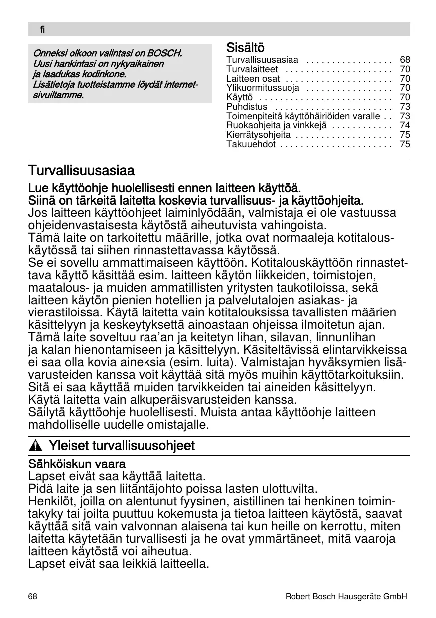 Onneksi olkoon valintasi on BOSCH. Uusi hankintasi on nykyaikainen ja laadukas kodinkone. Lisätietoja tuotteistamme löydät internetsivuiltamme. Sisältö Turvallisuusasiaa . . . . . . . . . . . . . . . . . Turvalaitteet . . . . . . . . . . . . . . . . . . . . . Laitteen osat . . . . . . . . . . . . . . . . . . . . . Ylikuormitussuoja . . . . . . . . . . . . . . . . . Käyttö . . . . . . . . . . . . . . . . . . . . . . . . . . Puhdistus . . . . . . . . . . . . . . . . . . . . . . . Toimenpiteitä käyttöhäiriöiden varalle . . Ruokaohjeita ja vinkkejä . . . . . . . . . . . . Kierrätysohjeita . . . . . . . . . . . . . . . . . . . Takuuehdot . . . . . . . . . . . . . . . . . . . . . .