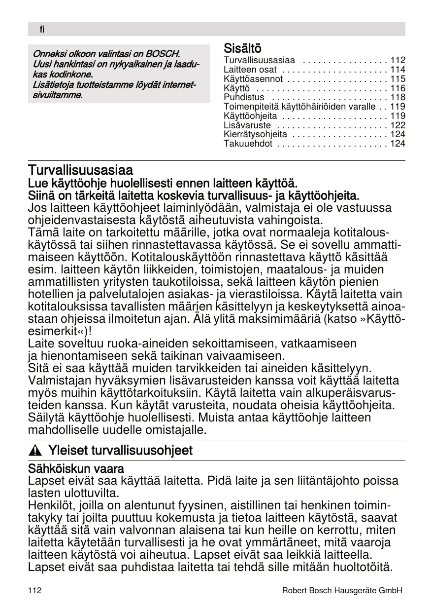 , Laitetta koskevat turvallisuusohjeet Loukkaantumisvaara Sähköiskun vaara! Kytke pistotulppa pistorasiaan vasta sitten, kun kaikki alkuvalmistelut koneella työskentelyä varten on tehty. Älä upota peruslaitetta veteen tai muihin nesteisiin tai pese sitä juoksevan veden alla. Älä käytä höyrypuhdistinta. Älä muuta monitoimivarren asentoa, kun laite on toiminnassa. Odota, että moottori on pysähtynyt. Vaihda varuste/lisävaruste vain moottorin ollessa pysähdyksissä – moottori toimii vielä jonkin aikaa virrankatkaisun jälkeen. Käynnistä ja pysäytä laite ainoastaan valitsimesta. Kun et käytä konetta, irrota pistotulppa pistorasiasta. Irrota pistotulppa pistorasiasta ennen häiriön poistamista. Varo pyöriviä varusteita – loukkaantumisvaara! Älä tartu kulhoon koneen ollessa toiminnassa. Työskentele vain kannen (12) ollessa paikallaan. Varo koskettamasta pyöriviin osiin. Vaihda varuste vain kun moottori on pysähtynyt – moottori toimii vielä jonkin aikaa virrankatkaisun jälkeen ja kone pysähtyy varusteiden vaihtoasentoon/»Easy fill«-asentoon. Aseta monitoimivarsi toiseen asentoon vasta sitten, kun varuste on pysähtynyt. Koneen saa käynnistää vain, kun tehosekoitin on käännetty vasteeseen asti ja varusteiden käyttöliitännän suojakansi (7) on paikallaan. Aseta suojakansi sen käyttöliitännän päälle, joka ei ole käytössä. Varo terävää terää – loukkaantumisvaara! Älä koske tehosekoittimen terään paljain käsin. Käytä puhdistamiseen harjaa. Varo terävää terää/pyörivää käyttöakselia – loukkaantumisvaara! Älä tartu paikalleen kiinnitettyyn tehosekoittimeen! Irrota/kiinnitä tehosekoitin vain kun koneen moottori on pysähtynyt! Kokoa ensin tehosekoitin ja kiinnitä se vasta sitten peruskoneeseen. Älä käytä tehosekoitinta ilman kantta. Robert Bosch Hausgeräte GmbH