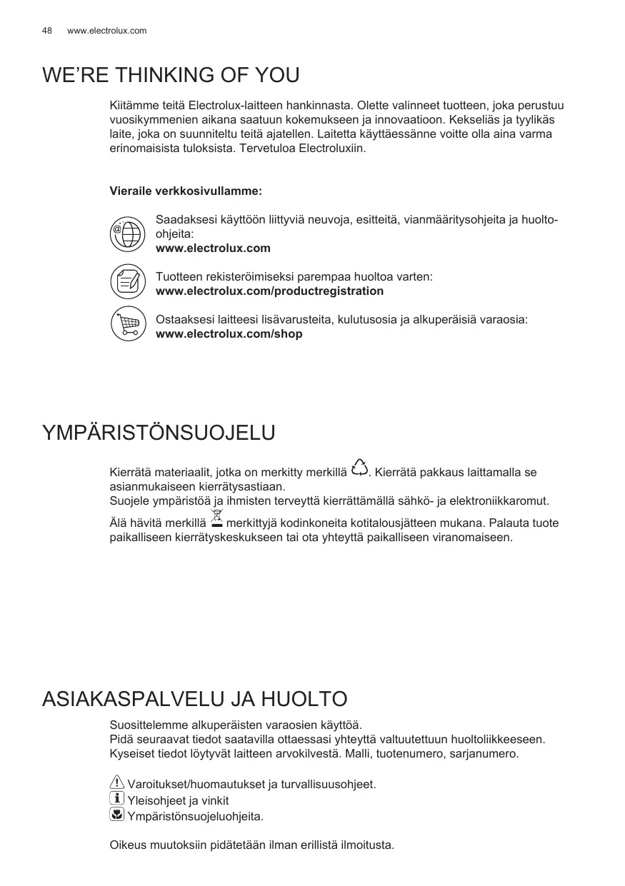 Kiitämme teitä Electrolux-laitteen hankinnasta. Olette valinneet tuotteen, joka perustuu vuosikymmenien aikana saatuun kokemukseen ja innovaatioon. Kekseliäs ja tyylikäs laite, joka on suunniteltu teitä ajatellen. Laitetta käyttäessänne voitte olla aina varma erinomaisista tuloksista. Tervetuloa Electroluxiin. Vieraile verkkosivullamme: Saadaksesi käyttöön liittyviä neuvoja, esitteitä, vianmääritysohjeita ja huoltoohjeita: www.electrolux.com Tuotteen rekisteröimiseksi parempaa huoltoa varten: www.electrolux.com/productregistration Ostaaksesi laitteesi lisävarusteita, kulutusosia ja alkuperäisiä varaosia: www.electrolux.com/shop