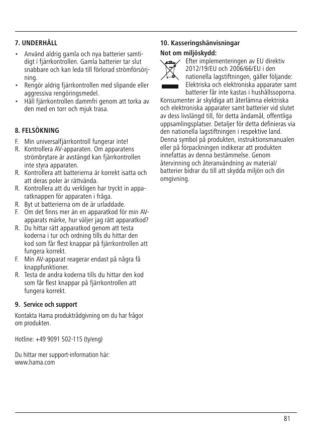 7. UNDERHÅLL • Använd aldrig gamla och nya batterier samtidigt i fjärrkontrollen. Gamla batterier tar slut snabbare och kan leda till förlorad strömförsörjning. • Rengör aldrig fjärrkontrollen med slipande eller aggressiva rengöringsmedel. • Håll fjärrkontrollen dammfri genom att torka av den med en torr och mjuk trasa. 8. FELSÖKNING F. Min universalfjärrkontroll fungerar inte! R. Kontrollera AV-apparaten. Om apparatens strömbrytare är avstängd kan fjärrkontrollen inte styra apparaten. R. Kontrollera att batterierna är korrekt isatta och att deras poler är rättvända. R. Kontrollera att du verkligen har tryckt in apparatknappen för apparaten i fråga. R. Byt ut batterierna om de är urladdade. F. Om det finns mer än en apparatkod för min AVapparats märke, hur väljer jag rätt apparatkod? R. Du hittar rätt apparatkod genom att testa koderna i tur och ordning tills du hittar den kod som får flest knappar på fjärrkontrollen att fungera korrekt. F. Min AV-apparat reagerar endast på några få knappfunktioner. R. Testa de andra koderna tills du hittar den kod som får flest knappar på fjärrkontrollen att fungera korrekt.