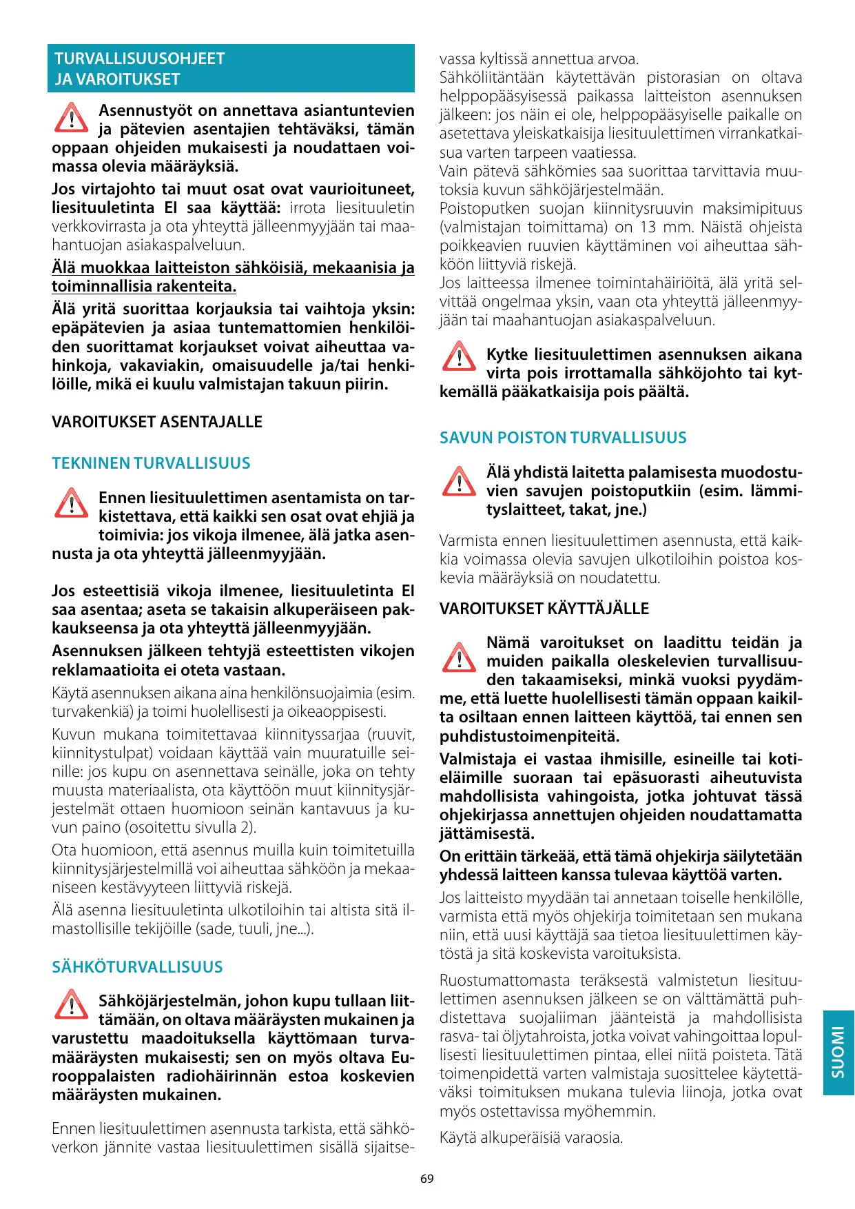 SUOMI Nämä varoitukset on laadittu teidän ja muiden paikalla oleskelevien turvallisuuden takaamiseksi, minkä vuoksi pyydämme, että luette huolellisesti tämän oppaan kaikilta osiltaan ennen laitteen käyttöä, tai ennen sen puhdistustoimenpiteitä. Valmistaja ei vastaa ihmisille, esineille tai kotieläimille suoraan tai epäsuorasti aiheutuvista mahdollisista vahingoista, jotka johtuvat tässä ohjekirjassa annettujen ohjeiden noudattamatta jättämisestä. On erittäin tärkeää, että tämä ohjekirja säilytetään yhdessä laitteen kanssa tulevaa käyttöä varten. Jos laitteisto myydään tai annetaan toiselle henkilölle, varmista että myös ohjekirja toimitetaan sen mukana niin, että uusi käyttäjä saa tietoa liesituulettimen käytöstä ja sitä koskevista varoituksista.