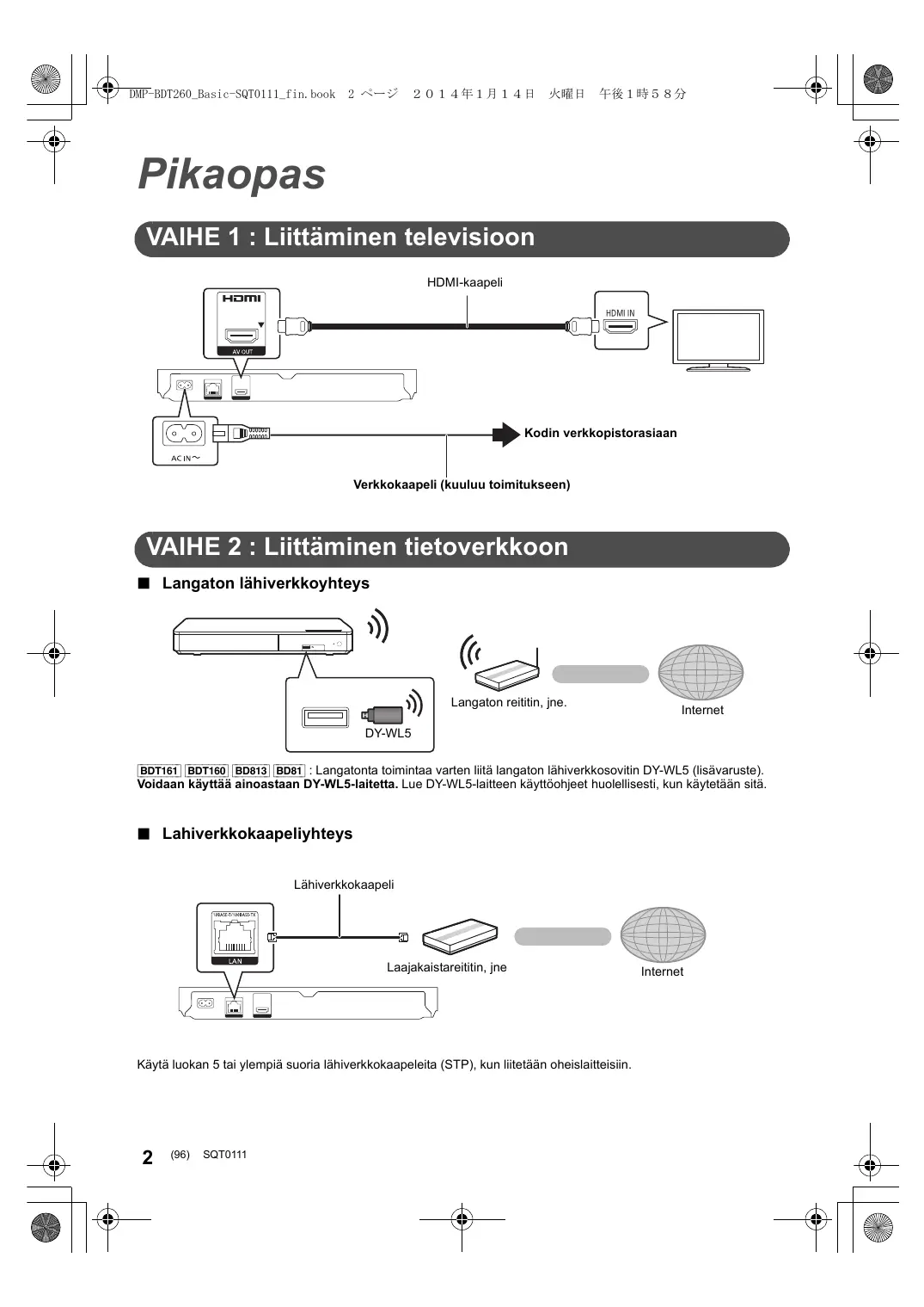 Pikaopas VAIHE 1 : Liittäminen televisioon HDMI-kaapeli HDMI IN Kodin verkkopistorasiaan Verkkokaapeli (kuuluu toimitukseen) VAIHE 2 : Liittäminen tietoverkkoon ∫ Langaton lähiverkkoyhteys Langaton reititin, jne. Internet DY-WL5 [BDT161] [BDT160] [BD813] [BD81] : Langatonta toimintaa varten liitä langaton lähiverkkosovitin DY-WL5 (lisävaruste). Voidaan käyttää ainoastaan DY-WL5-laitetta. Lue DY-WL5-laitteen käyttöohjeet huolellisesti, kun käytetään sitä. ∫ Lahiverkkokaapeliyhteys Lähiverkkokaapeli Laajakaistareititin, jne Käytä luokan 5 tai ylempiä suoria lähiverkkokaapeleita (STP), kun liitetään oheislaitteisiin.