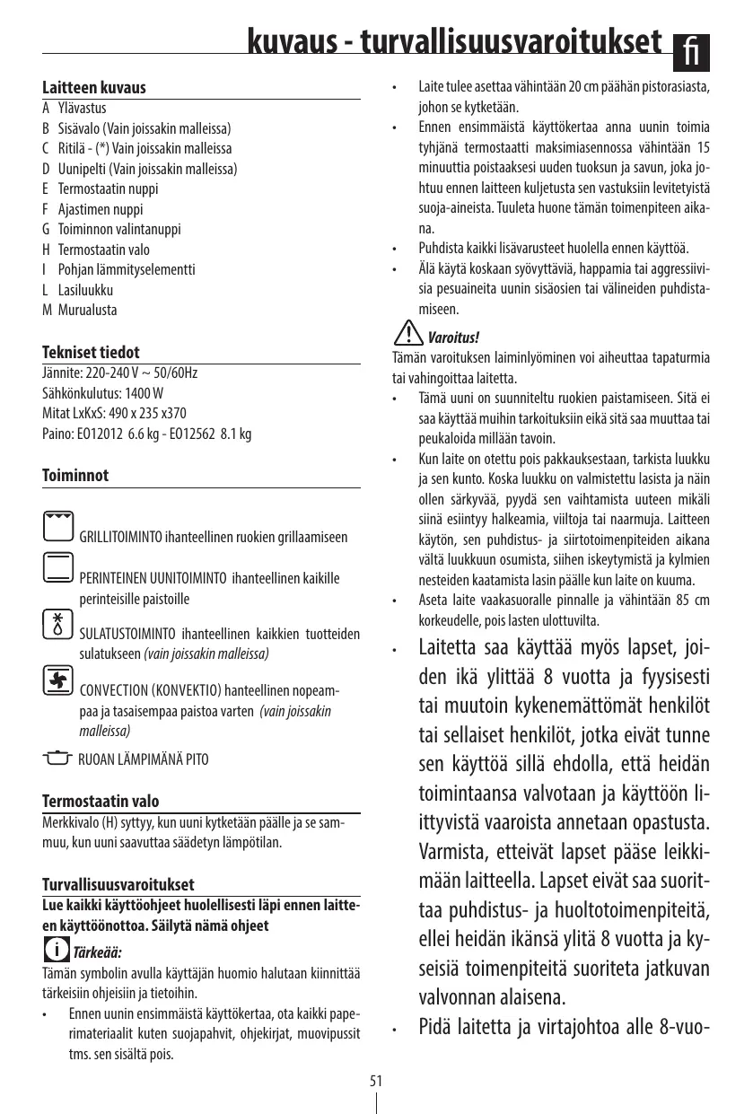L’appareil est tombé ou s’il présente des dégâts visibles ou des anomalies de fonctionnement. Le cas échéant, afin d’éviter tout risque, faites-le vérifier par le Centre de Service Après-vente le plus proche. N’installez pas l’appareil à proximité de sources de chaleur. N’utilisez pas l’appareil comme source de chaleur. Ne mettez jamais de papier, carton ou plastique dans le four et ne posez jamais rien dessus (ustensiles, grilles ou autres objets). N’introduisez rien dans les bouches de ventilation. Veillez à ne pas les obstruer. Ce four n’est pas conçu pour être encastré. Une fois la porte ouverte, n’y appuyez jamais des objets lourds, des casseroles ou récipients brûlants. Ne tirez pas la poignée vers le bas.