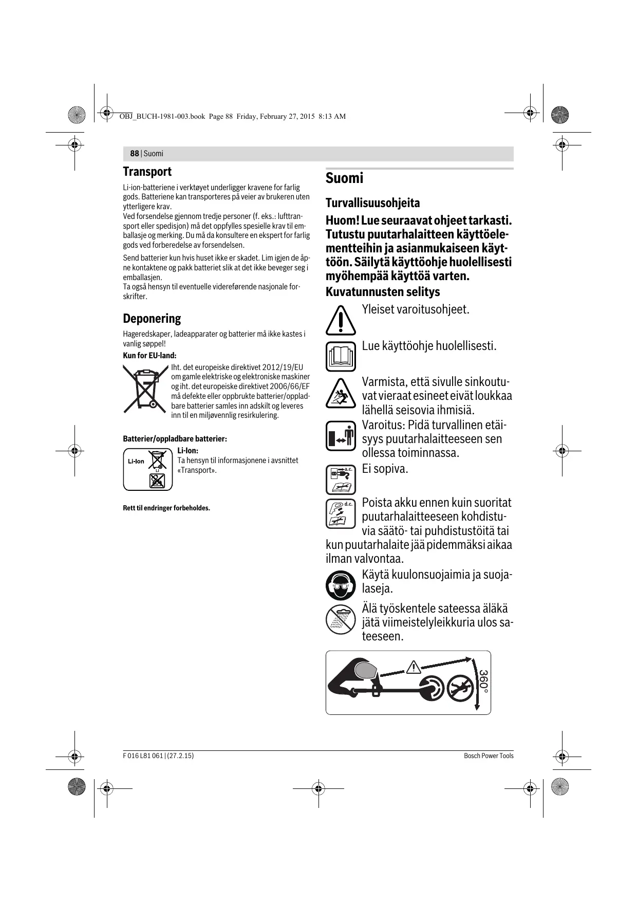 Ikke bruk et annet ladeapparat. Det medleverte ladeapparatet er tilpasset til Li-ion-batteriet som er innebygget i hageredskapet. Ta hensyn til strømspenningen! Spenningen til strømkilden må stemme overens med angivelsene på ladeapparatets typeskilt. Ladeapparater som er merket med 230 V kan også brukes med 220 V. Batteriet er utstyrt med en temperaturovervåking som kun muliggjør en opplading i temperaturområdet mellom 0 °C og 45 °C. Slik oppnås en lang levetid for batteriet. Merk: Batteriet leveres delvis oppladet. For å sikre full effekt fra batteriet, må du lade det fullstendig opp i ladeapparatet før førstegangs bruk. Litium-ion-batteriet kan lades opp til enhver tid uten at levetiden forkortes. Det skader ikke batteriet å avbryte oppladingen. Li-ion-batteriet er beskyttet av «Electronic Cell Protection (ECP)» mot total utlading. Når batteriet er utladet, kobles hageredskapet ut med en beskyttelseskobling: Kniven beveger seg ikke lenger. Trykk etter automatisk utkobling av hageredskapet ikke videre på på-/av-bryteren. Batteriet kan ta skade. Bosch Power Tools OBJ_BUCH-1981-003.book Page 87 Friday, February 27, 2015 8:13 AM Norsk | 87 Batteri ladeindikator Kontinuerlig lys batteri-ladeindikator Batteriets ladeindikator på grepet til produktet viser en lav ladetistand ved en tre gangers blinking når du trykker på på-/avbryteren. Ta i dette tilfellet batteriet ut og lad opp. Det kontinuerlige lyset i batteri-ladeindikatoren signaliserer at batteriet er helt oppladet eller at temperaturen til batteriet ligger utenfor det godkjente ladetemperaturområdet og derfor ikke kan lades opp. Såsnart det godkjente temperaturområdet er nådd, lades batteriet opp. Uten innsatt batteri signaliserer kontinuerlig lys i batteri-indikatoren at støpselet er satt inn i stikkontakten og at ladeapparatet er driftsklart. Opplading Oppladingen begynner med en gang nettstøpselet til ladeapparatet settes inn i stikkontakten og batteriet deretter settes inn i ladeapparatet . Med den intelligente oppladingsmetoden registreres batteriets oppladingstilstand automatisk og lades opp med optimal oppladingsstrøm avhengig av batteri-temperatur og -spenning. Slik skånes batteriet og er alltid fullt oppladet ved oppbevaring i ladeapparatet. Merk: Oppladingen er kun mulig hvis temperaturen på batteriet er i godkjent ladetemperaturområde, se avsnitt «Tekniske data». Informasjoner om opplading Ved kontinuerlige oppladingssykluser hhv. oppladingssykluser som følger rett etter hverandre uten avbrudd kan ladeapparatet bli varmt. Dette er ikke farlig og er ikke tegn på en teknisk defekt. En vesentlig kortere driftstid etter oppladingen er et tegn på at batteriet er oppbrukt og må skiftes ut. Blinklys batteri-ladeindikator Oppladingen signaliseres av blinking i batteri-ladeindikatoren . Feilsøking d.c. Symptomer Mulig årsak Utbedring Vernedekselet kan ikke trekkes over skjæreplaten Gal montering Fjern skjæreplate og monter vernedeksel på nytt Gresstrimmeren går ikke Utladet batteri Lad opp batteriet, se også «Henvisninger om opplading» For kaldt/varmt batteri Varm opp/avkjøl batteriet Interne kabelforbindelser i hageredskapet er defekt Ta kontakt med kundeservice På-/av-bryter defekt Ta kontakt med kundeservice Hageredskap overbelastet For høyt gress Klipp trinnvis Hageredskapet klipper ikke Skadet kniv Utskifting av kniven Forsterkede vibrasjoner Skadet kniv Utskifting av kniven Gresstrimmeren går rykkvis Kundeservice og rådgivning ved bruk www.bosch-garden.com Ved alle forespørsler og reservedelsbestillinger må du oppgi det 10-sifrede produktnummeret som er angitt på hageredskapets typeskilt. Bosch Power Tools Norsk Robert Bosch AS Postboks 350 1402 Ski Tel.: 64 87 89 50 Faks: 64 87 89 55 F 016 L81 061 | (27.2.15) OBJ_BUCH-1981-003.book Page 88 Friday, February 27, 2015 8:13 AM 88 | Suomi Transport Li-ion-batteriene i verktøyet underligger kravene for farlig gods. Batteriene kan transporteres på veier av brukeren uten ytterligere krav. Ved forsendelse gjennom tredje personer (f. eks.: lufttransport eller spedisjon) må det oppfylles spesielle krav til emballasje og merking. Du må da konsultere en ekspert for farlig gods ved forberedelse av forsendelsen. Send batterier kun hvis huset ikke er skadet. Lim igjen de åpne kontaktene og pakk batteriet slik at det ikke beveger seg i emballasjen. Ta også hensyn til eventuelle videreførende nasjonale forskrifter. Deponering Suomi Turvallisuusohjeita Huom! Lue seuraavat ohjeet tarkasti. Tutustu puutarhalaitteen käyttöelementteihin ja asianmukaiseen käyttöön. Säilytä käyttöohje huolellisesti myöhempää käyttöä varten. Kuvatunnusten selitys Yleiset varoitusohjeet. Hageredskaper, ladeapparater og batterier må ikke kastes i vanlig søppel! Kun for EU-land: Iht. det europeiske direktivet 2012/19/EU om gamle elektriske og elektroniske maskiner og iht. det europeiske direktivet 2006/66/EF må defekte eller oppbrukte batterier/oppladbare batterier samles inn adskilt og leveres inn til en miljøvennlig resirkulering. Batterier/oppladbare batterier: Li-Ion: Ta hensyn til informasjonene i avsnittet «Transport». Rett til endringer forbeholdes. Lue käyttöohje huolellisesti. a.c. Varmista, että sivulle sinkoutuvat vieraat esineet eivät loukkaa lähellä seisovia ihmisiä. Varoitus: Pidä turvallinen etäisyys puutarhalaitteeseen sen ollessa toiminnassa. Ei sopiva. Poista akku ennen kuin suoritat puutarhalaitteeseen kohdistuvia säätö- tai puhdistustöitä tai kun puutarhalaite jää pidemmäksi aikaa ilman valvontaa. Käytä kuulonsuojaimia ja suojalaseja. d.c. Älä työskentele sateessa äläkä jätä viimeistelyleikkuria ulos sateeseen. F 016 L81 061 | (27.2.15) Bosch Power Tools OBJ_BUCH-1981-003.book Page 89 Friday, February 27, 2015 8:13 AM Suomi | 89 Varmista, että sivulle sinkoutuvat vieraat esineet eivät loukkaa lähellä seisovia ihmisiä. Varoitus: Pidä turvallinen etäisyys puutarhalaitteeseen sen olless