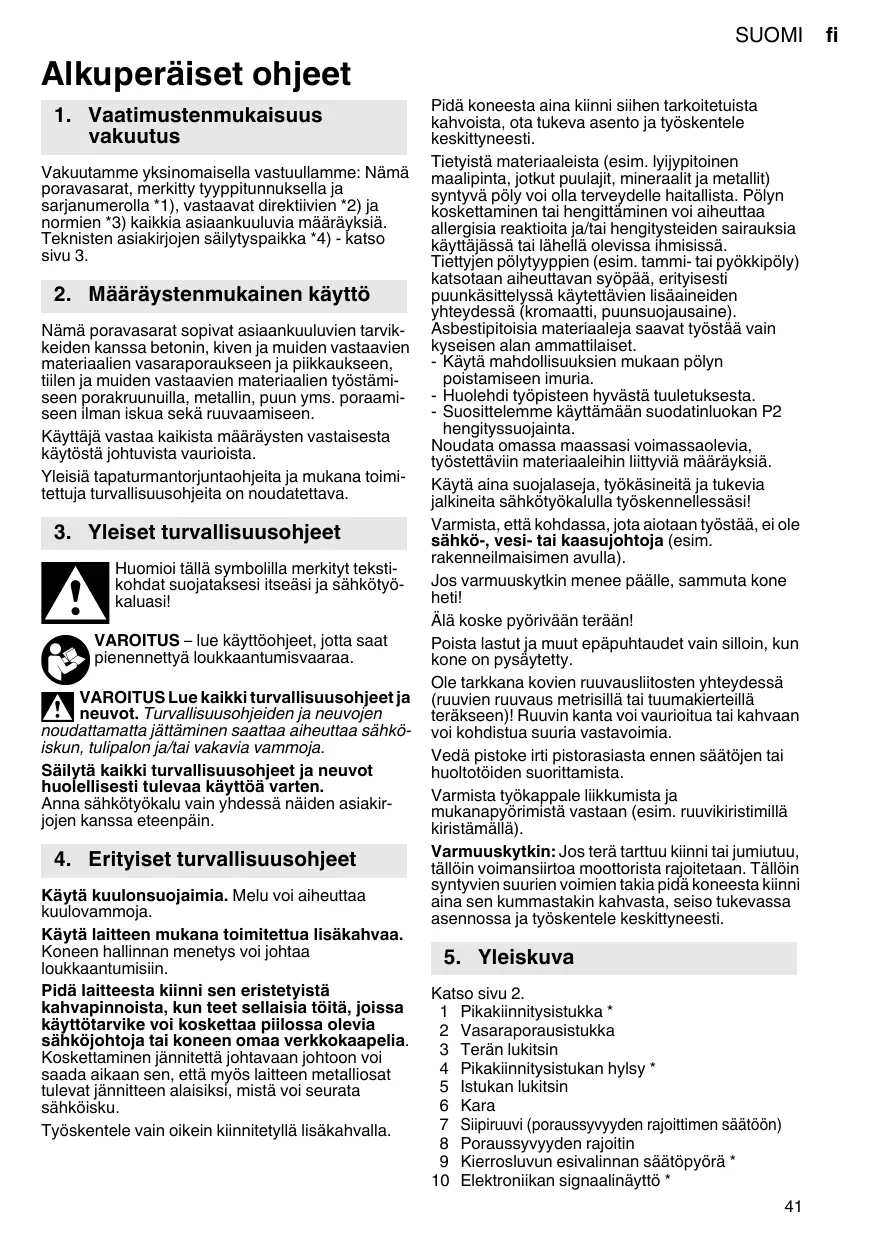 2. Utilisation conforme à la destination Equipé des accessoires correspondants, ces perceuses à percussion sont prévues pour travailler avec des forets marteau et des burins dans le béton, la pierre ou des matériaux similaires, et avec des trépans dans les tuiles, etc., ainsi que pour percer sans percussion dans le métal, le bois, etc. ou pour serrer des vis. L'utilisateur sera entièrement responsable de tous dommages résultant d'une utilisation non conforme à la destination de l'appareil. Il est impératif de respecter les consignes générales de protection contre les accidents ainsi que les consignes de sécurité ci-jointes.