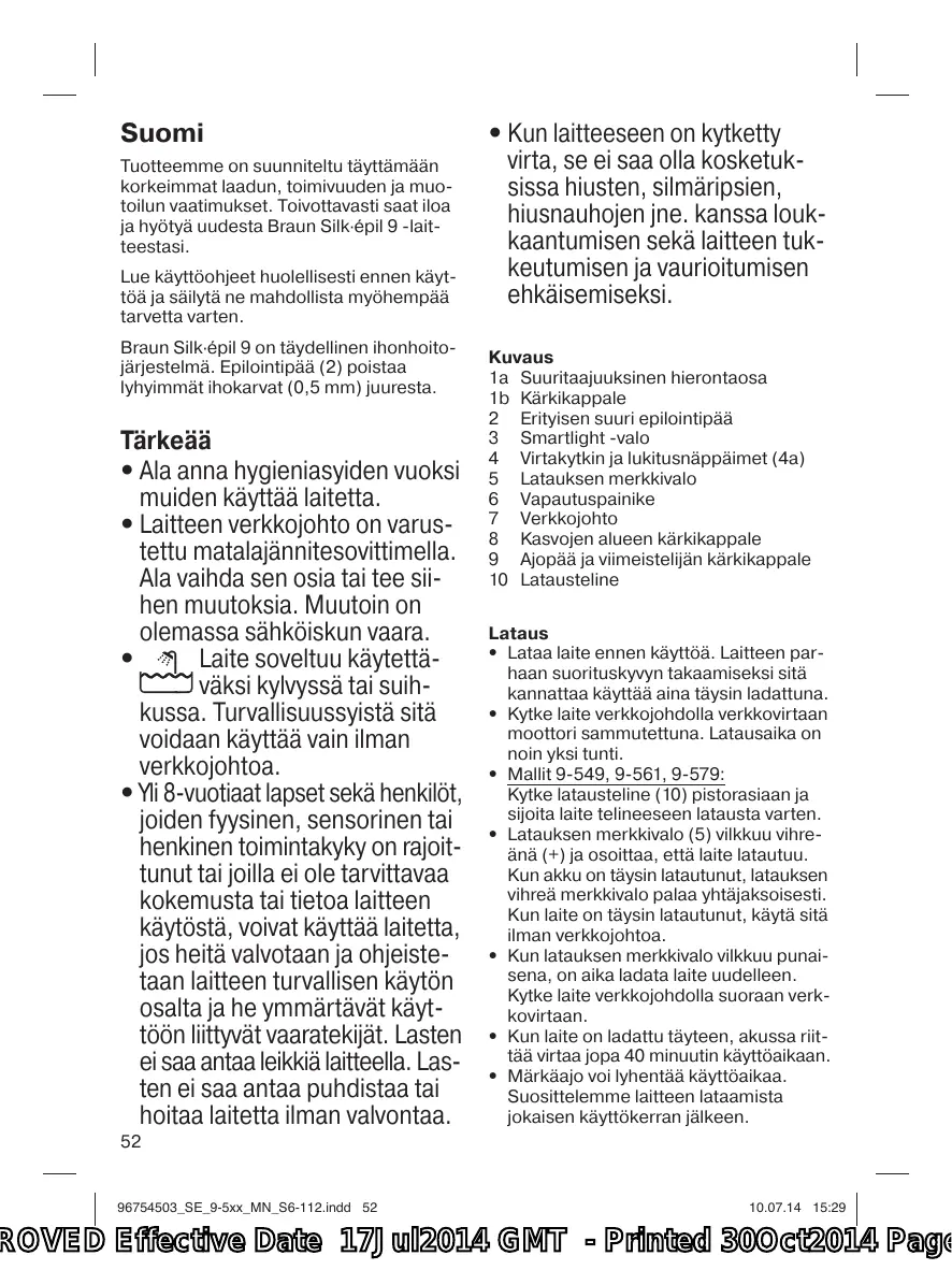 Suomi Tuotteemme on suunniteltu täyttämään korkeimmat laadun, toimivuuden ja muotoilun vaatimukset. Toivottavasti saat iloa ja hyötyä uudesta Braun Silk·épil 9 -laitteestasi. Lue käyttöohjeet huolellisesti ennen käyttöä ja säilytä ne mahdollista myöhempää tarvetta varten. Braun Silk·épil 9 on täydellinen ihonhoitojärjestelmä. Epilointipää (2) poistaa lyhyimmät ihokarvat (0,5 mm) juuresta.