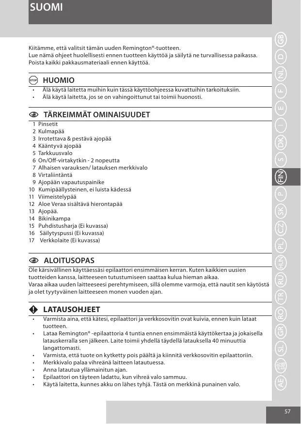 SUOMI Kiitämme, että valitsit tämän uuden Remington®-tuotteen. Lue nämä ohjeet huolellisesti ennen tuotteen käyttöä ja säilytä ne turvallisessa paikassa. Poista kaikki pakkausmateriaali ennen käyttöä. A HUOMIO