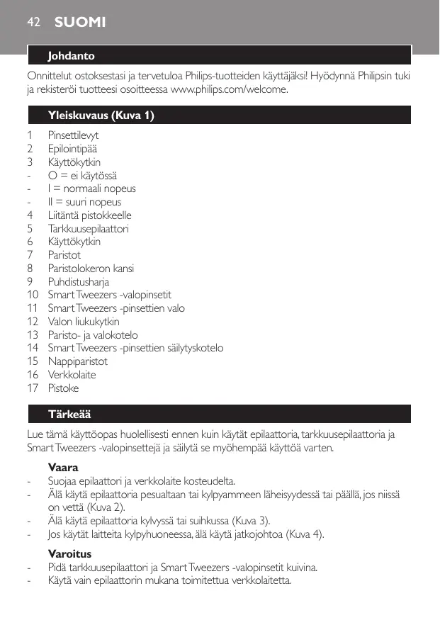 Pinsettilevyt Epilointipää Käyttökytkin O = ei käytössä I = normaali nopeus II = suuri nopeus Liitäntä pistokkeelle Tarkkuusepilaattori Käyttökytkin Paristot Paristolokeron kansi Puhdistusharja Smart Tweezers -valopinsetit Smart Tweezers -pinsettien valo Valon liukukytkin Paristo- ja valokotelo Smart Tweezers -pinsettien säilytyskotelo Nappiparistot Verkkolaite Pistoke Tärkeää Lue tämä käyttöopas huolellisesti ennen kuin käytät epilaattoria, tarkkuusepilaattoria ja Smart Tweezers -valopinsettejä ja säilytä se myöhempää käyttöä varten.