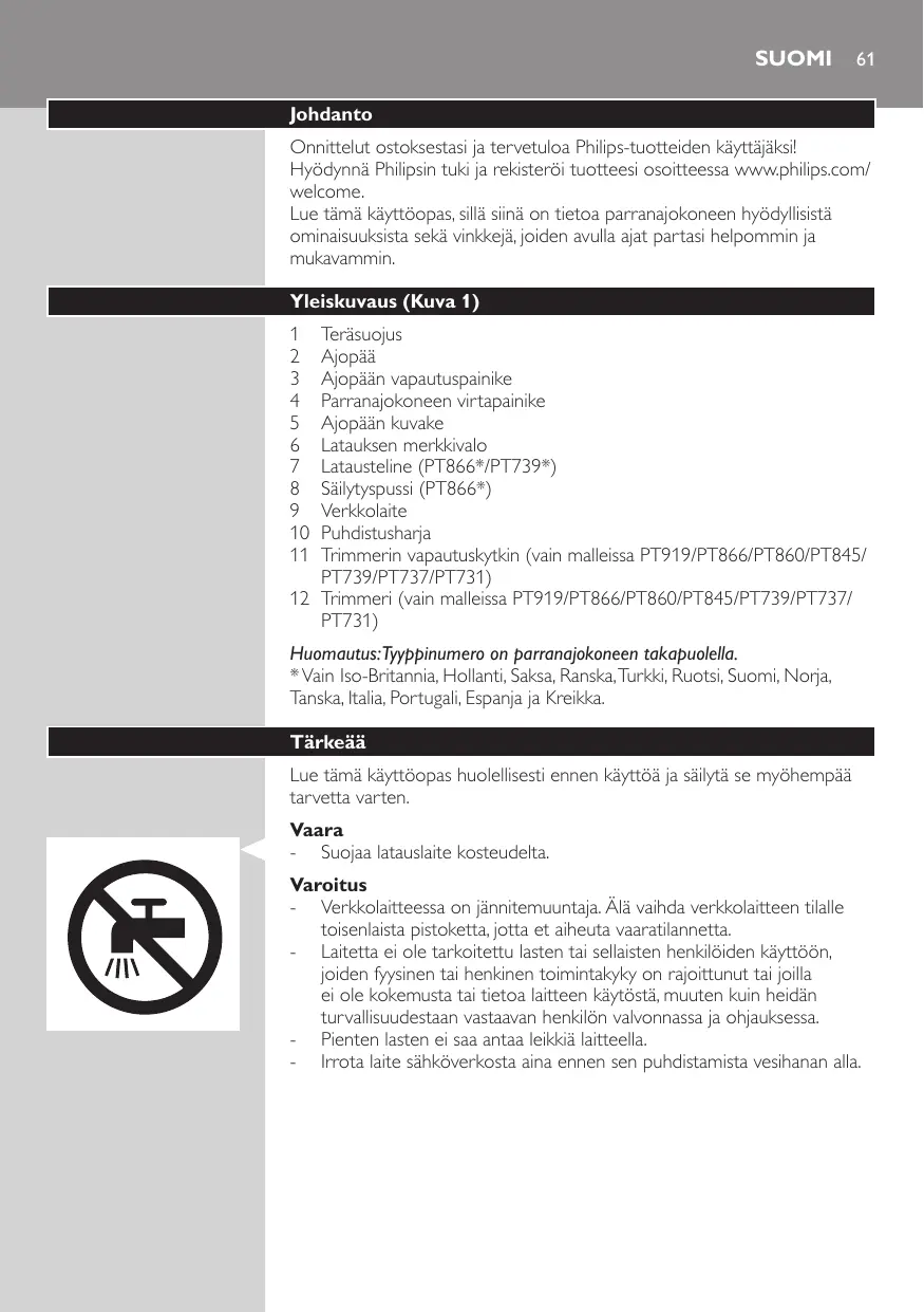 - Älä käytä parranajokonetta, verkkolaitetta tai muuta osa, jos se on vahingoittunut, koska se saattaa aiheuttaa vammoja. Vaihda vahingoittuneen verkkolaitteen, laturin tai osan tilalle aina alkuperäisen tyyppinen osa.