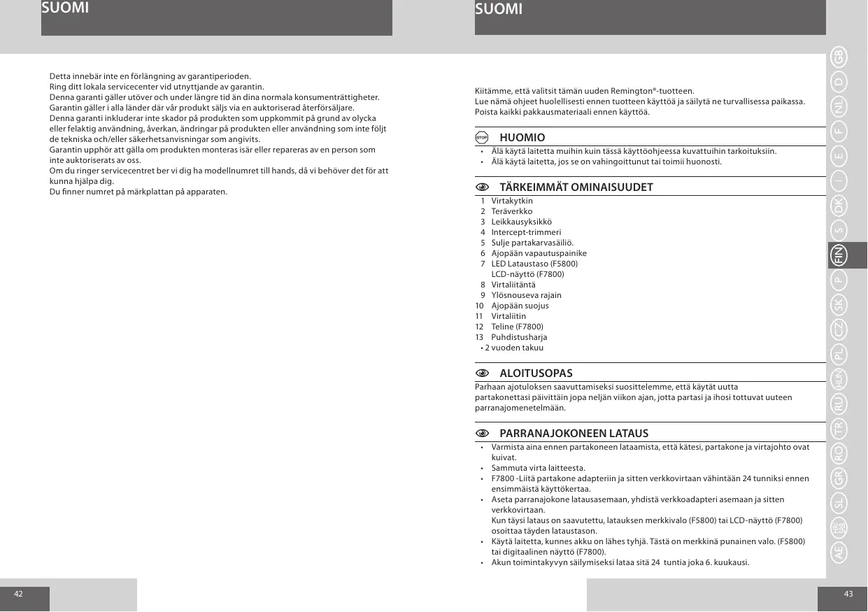 SUOMI Detta innebär inte en förlängning av garantiperioden. Ring ditt lokala servicecenter vid utnyttjande av garantin. Denna garanti gäller utöver och under längre tid än dina normala konsumenträttigheter. Garantin gäller i alla länder där vår produkt säljs via en auktoriserad återförsäljare. Denna garanti inkluderar inte skador på produkten som uppkommit på grund av olycka eller felaktig användning, åverkan, ändringar på produkten eller användning som inte följt de tekniska och/eller säkerhetsanvisningar som angivits. Garantin upphör att gälla om produkten monteras isär eller repareras av en person som inte auktoriserats av oss. Om du ringer servicecentret ber vi dig ha modellnumret till hands, då vi behöver det för att kunna hjälpa dig. Du finner numret på märkplattan på apparaten. SUOMI Kiitämme, että valitsit tämän uuden Remington®-tuotteen. Lue nämä ohjeet huolellisesti ennen tuotteen käyttöä ja säilytä ne turvallisessa paikassa. Poista kaikki pakkausmateriaali ennen käyttöä. A HUOMIO