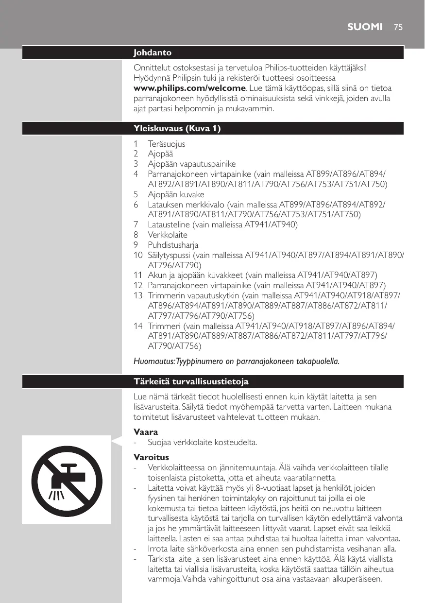 Teräsuojus Ajopää Ajopään vapautuspainike Parranajokoneen virtapainike (vain malleissa AT899/AT896/AT894/ AT892/AT891/AT890/AT811/AT790/AT756/AT753/AT751/AT750) Ajopään kuvake Latauksen merkkivalo (vain malleissa AT899/AT896/AT894/AT892/ AT891/AT890/AT811/AT790/AT756/AT753/AT751/AT750) Latausteline (vain malleissa AT941/AT940) Verkkolaite Puhdistusharja Säilytyspussi (vain malleissa AT941/AT940/AT897/AT894/AT891/AT890/ AT796/AT790) Akun ja ajopään kuvakkeet (vain malleissa AT941/AT940/AT897) Parranajokoneen virtapainike (vain malleissa AT941/AT940/AT897) Trimmerin vapautuskytkin (vain malleissa AT941/AT940/AT918/AT897/ AT896/AT894/AT891/AT890/AT889/AT887/AT886/AT872/AT811/ AT797/AT796/AT790/AT756) Trimmeri (vain malleissa AT941/AT940/AT918/AT897/AT896/AT894/ AT891/AT890/AT889/AT887/AT886/AT872/AT811/AT797/AT796/ AT790/AT756) Huomautus:Tyyppinumero on parranajokoneen takapuolella. Tärkeitä turvallisuustietoja Lue nämä tärkeät tiedot huolellisesti ennen kuin käytät laitetta ja sen lisävarusteita. Säilytä tiedot myöhempää tarvetta varten. Laitteen mukana toimitetut lisävarusteet vaihtelevat tuotteen mukaan. Vaara -- Suojaa verkkolaite kosteudelta. Varoitus -- Verkkolaitteessa on jännitemuuntaja. Älä vaihda verkkolaitteen tilalle toisenlaista pistoketta, jotta et aiheuta vaaratilannetta. -- Laitetta voivat käyttää myös yli 8-vuotiaat lapset ja henkilöt, joiden fyysinen tai henkinen toimintakyky on rajoittunut tai joilla ei ole kokemusta tai tietoa laitteen käytöstä, jos heitä on neuvottu laitteen turvallisesta käytöstä tai tarjolla on turvallisen käytön edellyttämä valvonta ja jos he ymmärtävät laitteeseen liittyvät vaarat. Lapset eivät saa leikkiä laitteella. Lasten ei saa antaa puhdistaa tai huoltaa laitetta ilman valvontaa. -- Irrota laite sähköverkosta aina ennen sen puhdistamista vesihanan alla. -- Tarkista laite ja sen lisävarusteet aina ennen käyttöä. Älä käytä viallista laitetta tai viallisia lisävarusteita, koska käytöstä saattaa tällöin aiheutua vammoja. Vaihda vahingoittunut osa aina vastaavaan alkuperäiseen.