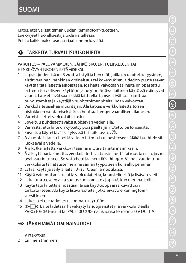NL F E I DK S FIN P SK CZ PL HUN RU TR RO GR SI HR VAROITUS – PALOVAMMOJEN, SÄHKÖISKUJEN, TULIPALOJEN TAI HENKILÖVAHINKOJEN ESTÄMISEKSI: 1 Lapset joiden ikä on 8 vuotta tai yli ja henkilöt, joilla on rajoitettu fyysinen, aistinvarainen, henkinen ominaisuus tai kokemuksen ja tiedon puute saavat käyttää tätä laitetta ainoastaan, jos heitä valvotaan tai heitä on opastettu laitteen turvalliseen käyttöön ja he ymmärtävät laitteen käytössä esiintyvät vaarat. Lapset eivät saa leikkiä laitteella. Lapset eivät saa suorittaa puhdistamista ja käyttäjän huoltotoimenpiteitä ilman valvontaa. 2 Verkkolaite sisältää muuntajan. Älä katkaise verkkolaitetta toisen pistokkeen vaihtamiseksi. Se aiheuttaa hengenvaarallisen tilanteen. 3 Varmista, ettei verkkolaite kastu. 4 Soveltuu puhdistettavaksi juoksevan veden alla. 5 Varmista, että laite on kytketty pois päältä ja irrotettu pistorasiasta. 6 Soveltuu käytettäväksi kylvyssä tai suihkussa. 7 Älä upota lataustelinettä veteen tai muuhun nesteeseen äläkä huuhtele sitä juoksevalla vedellä. 8 Älä kytke laitetta verkkovirtaan tai irrota sitä siitä märin käsin. 9 Älä käytä partakonetta, verkkolaitetta, lataustelinettä tai muuta osaa, jos ne ovat vaurioituneet. Se voi aiheuttaa henkilövahingon. Vaihda vaurioitunut verkkolaite tai latausteline aina saman tyyppiseen kuin alkuperäinen. 10 Lataa, käytä ja säilytä laite 10–35 °C:een lämpötilassa. 11 Käytä vain mukana tullutta verkkolaitetta, lataustelinettä ja lisävarusteita. 12 Laita tuotteeseen aina suojus suojaamaan ajopäitä, kun olet matkoilla. 13 Käytä tätä laitetta ainoastaan tässä käyttöoppaassa kuvattuun tarkoitukseen. Älä käytä lisävarusteita, jotka eivät ole Remingtonin suosittelemia. 14 Laitetta ei ole tarkoitettu ammattikäyttöön. 15 Laite ladataan hyväksytyllä suojaeristetyllä verkkolaitteella PA-0510E (EU-malli) tai PA0510U (UK-malli), jonka teho on 5,0 V DC; 1 A;