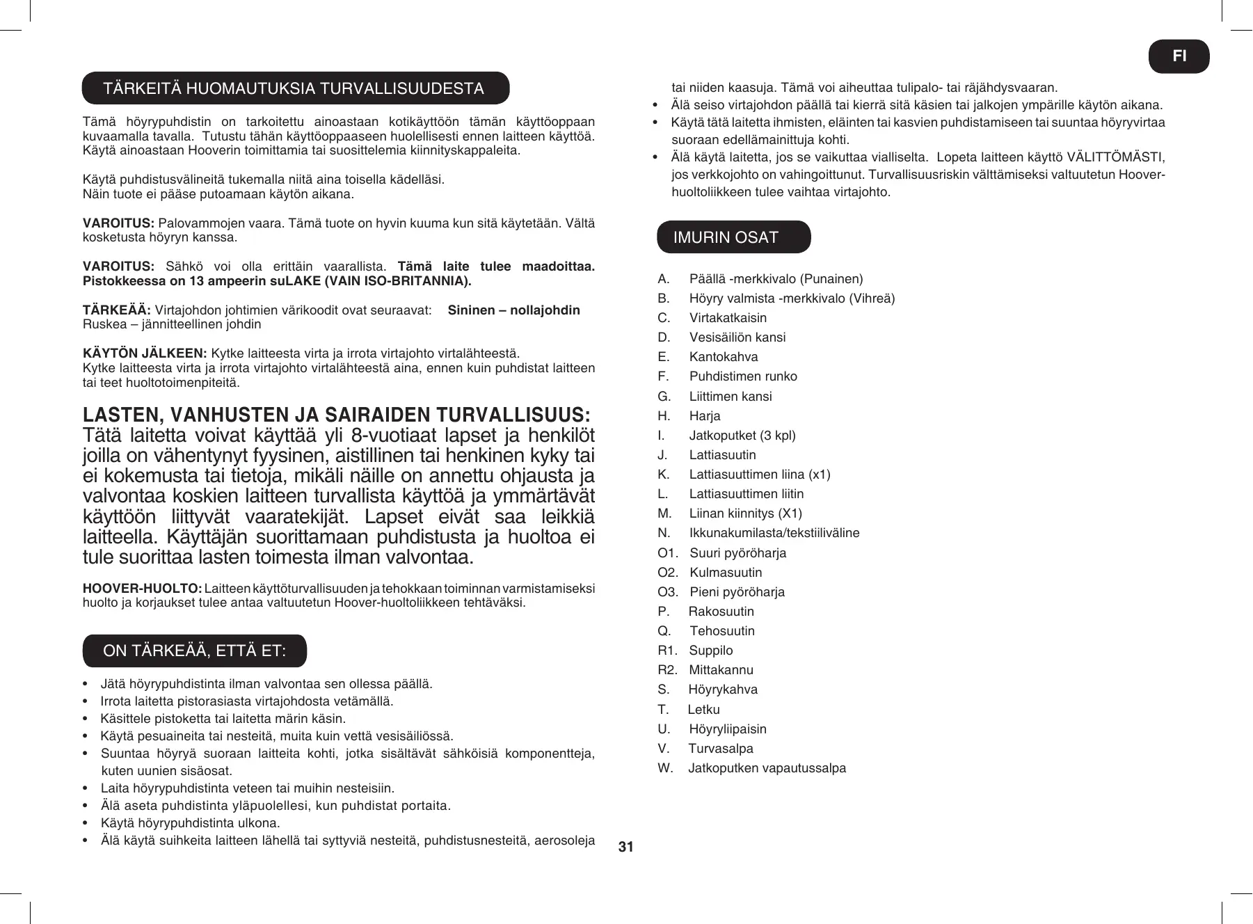 Sininen – nollajohdin KÄYTÖN JÄLKEEN: Kytke laitteesta virta ja irrota virtajohto virtalähteestä. Kytke laitteesta virta ja irrota virtajohto virtalähteestä aina, ennen kuin puhdistat laitteen tai teet huoltotoimenpiteitä. LASTEN, VANHUSTEN JA SAIRAIDEN TURVALLISUUS: Tätä laitetta voivat käyttää yli 8-vuotiaat lapset ja henkilöt joilla on vähentynyt fyysinen, aistillinen tai henkinen kyky tai ei kokemusta tai tietoja, mikäli näille on annettu ohjausta ja valvontaa koskien laitteen turvallista käyttöä ja ymmärtävät käyttöön liittyvät vaaratekijät. Lapset eivät saa leikkiä laitteella. Käyttäjän suorittamaan puhdistusta ja huoltoa ei tule suorittaa lasten toimesta ilman valvontaa. HOOVER-HUOLTO: Laitteen käyttöturvallisuuden ja tehokkaan toiminnan varmistamiseksi huolto ja korjaukset tulee antaa valtuutetun Hoover-huoltoliikkeen tehtäväksi. ON tärkeää, että et: