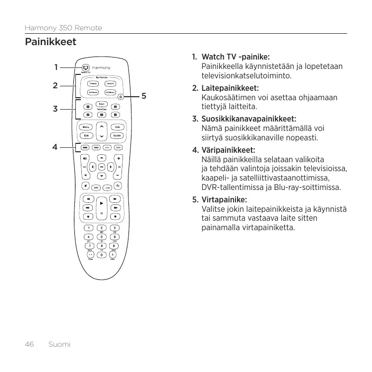 Configurez ces boutons pour accéder rapidement à vos chaînes TV préférées. 4. Boutons de couleur: Naviguez dans les menus et sélectionnez des options sur certains téléviseurs, récepteurs câble/satellite, enregistreurs numériques et lecteurs Blu-ray. 5. Bouton d'alimentation: Sélectionnez un bouton Dispositif, puis utilisez le bouton d'alimentation pour mettre le dispositif correspondant sous ou hors tension.