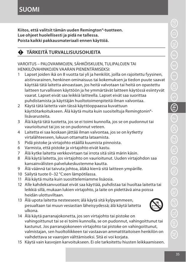 VAROITUS – PALOVAMMOJEN, SÄHKÖISKUJEN, TULIPALOJEN TAI HENKILÖVAHINKOJEN VAARAN PIENENTÄMISEKSI: 1 Lapset joiden ikä on 8 vuotta tai yli ja henkilöt, joilla on rajoitettu fyysinen, aistinvarainen, henkinen ominaisuus tai kokemuksen ja tiedon puute saavat käyttää tätä laitetta ainoastaan, jos heitä valvotaan tai heitä on opastettu laitteen turvalliseen käyttöön ja he ymmärtävät laitteen käytössä esiintyvät vaarat. Lapset eivät saa leikkiä laitteella. Lapset eivät saa suorittaa puhdistamista ja käyttäjän huoltotoimenpiteitä ilman valvontaa. 2 Käytä tätä laitetta vain tässä käyttöoppaassa kuvattuun käyttötarkoitukseen. Älä käytä muita kuin suositeltuja Remingtonin®lisävarusteita. 3 Älä käytä tätä tuotetta, jos se ei toimi kunnolla, jos se on pudonnut tai vaurioitunut tai jos se on pudonnut veteen. 4 Laitetta ei saa koskaan jättää ilman valvontaa, jos se on kytketty virtalähteeseen, lukuun ottamatta lataamista. 5 Pidä pistoke ja virtajohto etäällä kuumista pinnoista. 6 Varmista, että pistoke ja virtajohto eivät kastu. 7 Älä kytke laitetta verkkovirtaan tai irrota sitä siitä märin käsin. 8 Älä käytä laitetta, jos virtajohto on vaurioitunut. Uuden virtajohdon saa kansainvälisten palvelukeskustemme kautta. 9 Älä väännä tai taivuta johtoa, äläkä kierrä sitä laitteen ympärille. 10 Säilytä tuote 0–32 °C:een lämpötilassa. 11 Älä käytä muita kuin suosittelemiamme lisäosia. 12 Alle kahdeksanvuotiaat eivät saa käyttää, puhdistaa tai huoltaa laitetta tai leikkiä sillä, mukaan lukien virtajohto, ja laite on pidettävä aina poissa heidän ulottuviltaan. 13 Älä upota laitetta nesteeseen; älä käytä sitä kylpyammeen, pesualtaan tai muun vesiastian läheisyydessä; älä käytä laitetta ulkona. 14 Älä käytä parranajokonetta, jos sen virtajohto tai pistoke on vahingoittunut tai se ei toimi kunnolla, se on pudonnut, vahingoittunut tai kastunut. Jos parranajokoneen virtajohto tai pistoke on vahingoittunut, valmistajan, sen huoltoliikkeen tai vastaavan ammattitaitoisen henkilön on vaihdettava se vaarojen välttämiseksi. Sitä ei voi korjata. 15 Käytä vain kasvojen karvoitukseen. Ei ole tarkoitettu hiusten leikkaamiseen.