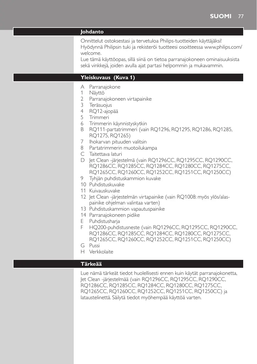 Tärkeää Lue nämä tärkeät tiedot huolellisesti ennen kuin käytät parranajokonetta, Jet Clean -järjestelmää (vain RQ1296CC, RQ1295CC, RQ1290CC, RQ1286CC, RQ1285CC, RQ1284CC, RQ1280CC, RQ1275CC, RQ1265CC, RQ1260CC, RQ1252CC, RQ1251CC, RQ1250CC) ja lataustelinettä. Säilytä tiedot myöhempää käyttöä varten.
