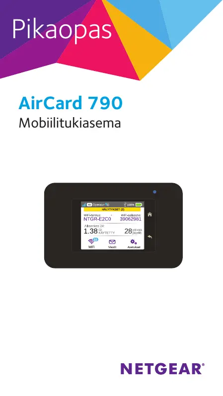 asetukset mobiilitukiaseman sivulla osoitteessa http://netgear.aircard. Mobiilitukiasema toimitetaan täysin käyttövalmiina. Asetusten muokkaaminen ei useimmiten ole tarpeellista. Tukiaseman oletusarvoiset suojausasetukset ovat täysin turvallisia. Huomautus: Jos viesti ilmoittaa, ettei mobiiliyhteyttä ole, sinun on ehkä lisättävä APN-yhteyspiste. Lisätietoja APN-yhteyspisteiden lisäämisestä on käyttöoppaassa.