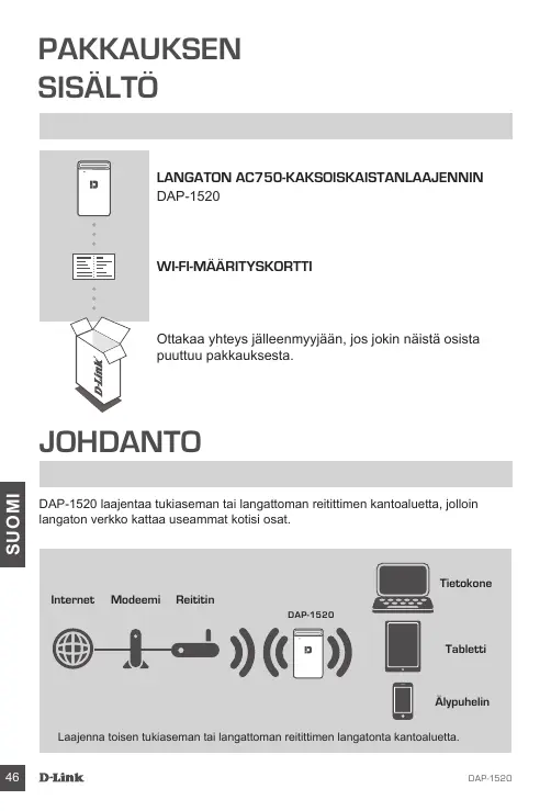 DAP-1520 WI-FI-MÄÄRITYSKORTTI Ottakaa yhteys jälleenmyyjään, jos jokin näistä osista puuttuu pakkauksesta. SUOMI JOHDANTO DAP-1520 laajentaa tukiaseman tai langattoman reitittimen kantoaluetta, jolloin langaton verkko kattaa useammat kotisi osat. Tietokone Internet Modeemi Reititin DAP-1520 Tabletti Älypuhelin Laajenna toisen tukiaseman tai langattoman reitittimen langatonta kantoaluetta.