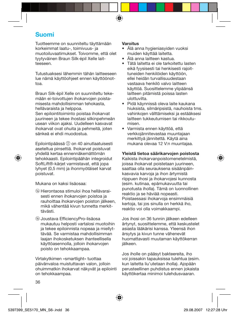 Suomi Tuotteemme on suunniteltu täyttämään korkeimmat laatu-, toimivuus- ja muotoiluvaatimukset. Toivomme, että olet tyytyväinen Braun Silk·épil Xelle laitteeseen. Tutustuaksesi lähemmin tähän laitteeseen lue nämä käyttöohjeet ennen käyttöönottoa. Braun Silk·épil Xelle on suunniteltu tekemään ei-toivottujen ihokarvojen poistamisesta mahdollisimman tehokasta, hellävaraista ja helppoa. Sen epilointitoiminto poistaa ihokarvat juurineen ja tekee ihostasi silkinpehmeän usean viikon ajaksi. Uudelleen kasvavat ihokarvat ovat ohuita ja pehmeitä, joten sänkeä ei ehdi muodostua. Epilointipäässä 2 on 40 ainutlaatuisesti aseteltua pinsettiä. Ihokarvat poistuvat yhdellä kertaa ennennäkemättömän tehokkaasti. Epilointipäähän integroidut SoftLift®-kärjet varmistavat, että jopa lyhyet (0,5 mm) ja ihonmyötäiset karvat poistuvat. Mukana on kaksi lisäosaa: A Hierontaosa stimuloi ihoa hellävaraisesti ennen ihokarvojen poistoa ja rauhoittaa ihokarvojen poiston jälkeen, mikä vähentää kivun tunnetta merkittävästi. a Joustava EfficiencyPro-lisäosa mukautuu helposti vartalosi muotoihin ja tekee epiloinnista nopeaa ja miellyttävää. Se varmistaa mahdollisimman laajan ihokosketuksen ihanteellisella käyttöasennolla, jolloin ihokarvojen poisto on tehokkaampaa. Virtakytkimen «smartlight» tuottaa päivänvaloa muistuttavan valon, jolloin ohuimmatkin ihokarvat näkyvät ja epilointi on tehokkaampaa. Varoitus