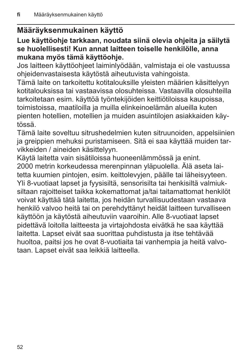 Cet appareil est conçu pour la préparation de quantités usuelles, dans le cadre d’un foyer ou d’un usage non commercial de type domestique. Citons p. ex. les cuisines du personnel dans les commerces, bureaux, exploitations agricoles et établissements artisanaux ainsi que les clients de pensions, petits hôtels et toute autre résidence de type similaire. Cet appareil est destiné à presser des agrumes, par exemple des citrons, oranges, pamplemousses. Il ne doit pas servir à transformer d’autres substances / objets. N’utilisez l’appareil que dans des pièces intérieures à température ambiante et jusqu’à 2 000 m au-dessus du niveau de la mer. Ne jamais poser l’appareil sur des surfaces chaudes (tables de cuisson par ex.) ou à proximité de celles-ci. Cet appareil peut être utilisé par des enfants à partir de 8 ans et par des personnes ayant des facultés physiques, sensorielles ou mentales réduites ou manquant d’expérience et/ou de connaissances à condition d’être surveillés ou d’avoir été informés quant à la bonne utilisation de l’appareil et d’avoir compris les dangers qui en découlent. Les enfants de moins de 8 ans doivent être tenus éloignés de l’appareil et du cordon d’alimentation et ne doivent pas utiliser l’appareil. Le nettoyage et l’entretien incombant à l’utilisateur ne doivent pas être effectués par des enfants sauf s’ils ont 8 ans ou plus et sont surveillés. Ne pas laisser les enfants jouer avec l’appareil.