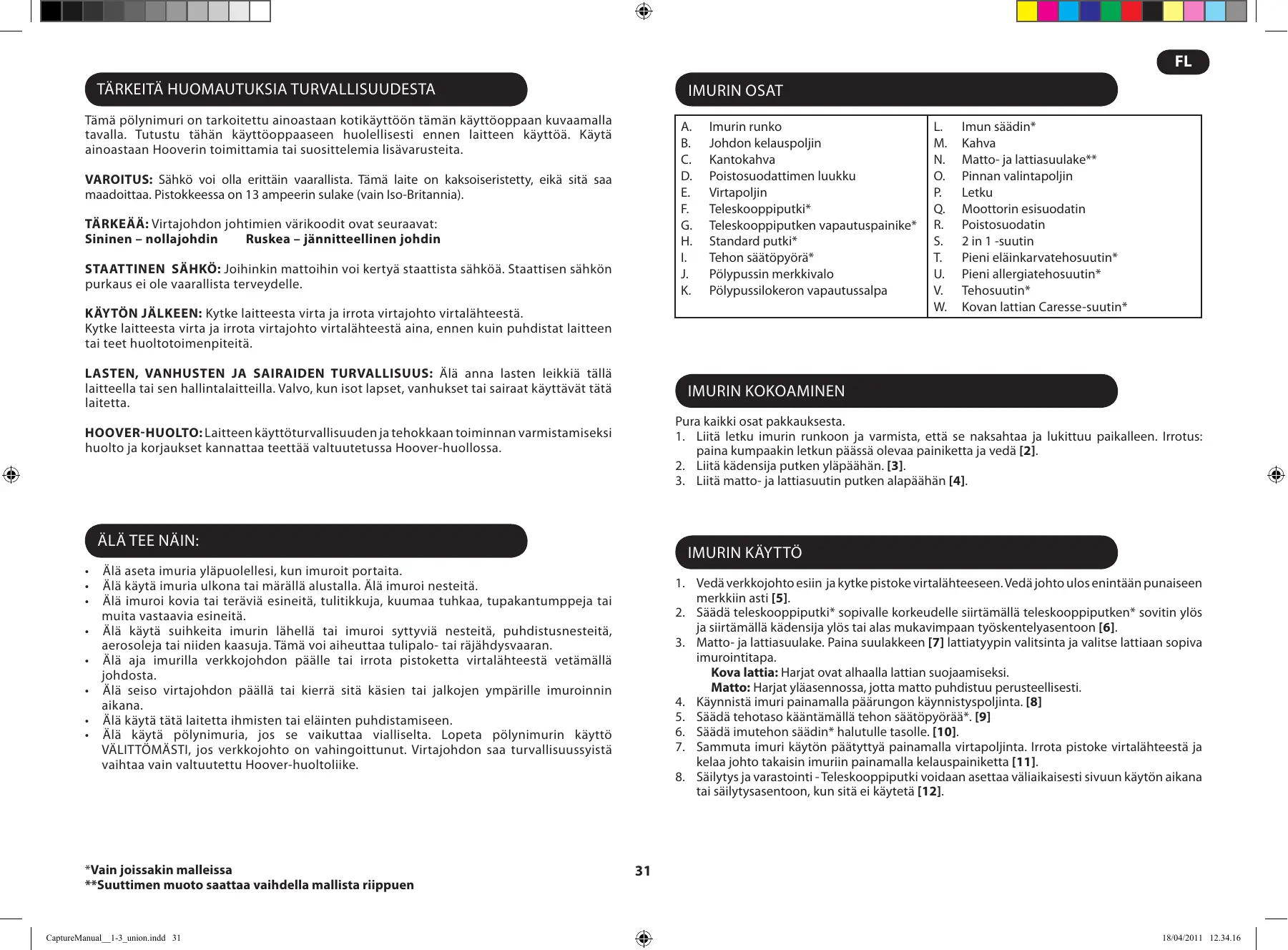 Älä aseta imuria yläpuolellesi, kun imuroit portaita. Älä käytä imuria ulkona tai märällä alustalla. Älä imuroi nesteitä. Älä imuroi kovia tai teräviä esineitä, tulitikkuja, kuumaa tuhkaa, tupakantumppeja tai muita vastaavia esineitä. Älä käytä suihkeita imurin lähellä tai imuroi syttyviä nesteitä, puhdistusnesteitä, aerosoleja tai niiden kaasuja. Tämä voi aiheuttaa tulipalo- tai räjähdysvaaran. Älä aja imurilla verkkojohdon päälle tai irrota pistoketta virtalähteestä vetämällä johdosta. Älä seiso virtajohdon päällä tai kierrä sitä käsien tai jalkojen ympärille imuroinnin aikana. Älä käytä tätä laitetta ihmisten tai eläinten puhdistamiseen. Älä käytä pölynimuria, jos se vaikuttaa vialliselta. Lopeta pölynimurin käyttö VÄLITTÖMÄSTI, jos verkkojohto on vahingoittunut. Virtajohdon saa turvallisuussyistä vaihtaa vain valtuutettu Hoover-huoltoliike. *Vain joissakin malleissa **Suuttimen muoto saattaa vaihdella mallista riippuen CaptureManual__1-3_union.indd 31 Imun säädin* Kahva Matto- ja lattiasuulake** Pinnan valintapoljin Letku Moottorin esisuodatin Poistosuodatin 2 in 1 -suutin Pieni eläinkarvatehosuutin* Pieni allergiatehosuutin* Tehosuutin* Kovan lattian Caresse-suutin* IMURIN KOKOAMINEN HOOVER-HUOLTO: Laitteen käyttöturvallisuuden ja tehokkaan toiminnan varmistamiseksi huolto ja korjaukset kannattaa teettää valtuutetussa Hoover-huollossa.
