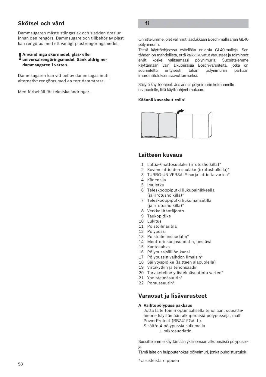 Por favor, guarde o manual de instruções e junte-o ao aspirador sempre que o entregar a terceiros. Nu trageţi de cablul de racord, ci de fişă pentru a scoate aparatul din priza de reţea. Nu trageţi şi nu striviţi cablul de legătură la reţea peste muchii ascuţite. Aveţi grijă ca ştecărul să nu se lovească de persoane, părţi ale corpului, animale sau obiecte la retractarea automată. => Ghidaţi cablul de racordare la reţea cu ajutorul ştecărului. Scoateţi aspiratorul din priză înaintea oricărei lucrări la el. Nu puneţi în funcţiune un aspirator dacă este deteriorat. În cazul existenţei unui deranjament scoateţi ştecherul din priză. Congratulations on your purchase of the Bosch GL40 vacuum cleaner. This instruction manual describes various GL40 models, which means that some of the equipment features and functions described may not apply to your model. You should only use original Bosch accessories, which have been specially developed for your vacuum cleaner, in order to achieve the best possible vacuuming results. Please keep this instruction manual. When passing the vacuum cleaner on to another person, please also hand over this instruction manual. Fold out the picture pages. Cette notice d’utilisation vaut pour différents modèles de la série GL40. Il se peut donc que toutes les caractéristiques et fonctions décrites ne concernent pas toutes votre aspirateur. Utilisez exclusivement les accessoires d'origine Bosch. Ils sont spécialement conçus pour votre aspirateur, afin d'obtenir un résultat de nettoyage optimal. Conservez cette notice d'utilisation. Si vous remettez l'aspirateur à une tierce personne, veuillez-y joindre sa notice d'utilisation. Veuillez déplier les pages illustrées!