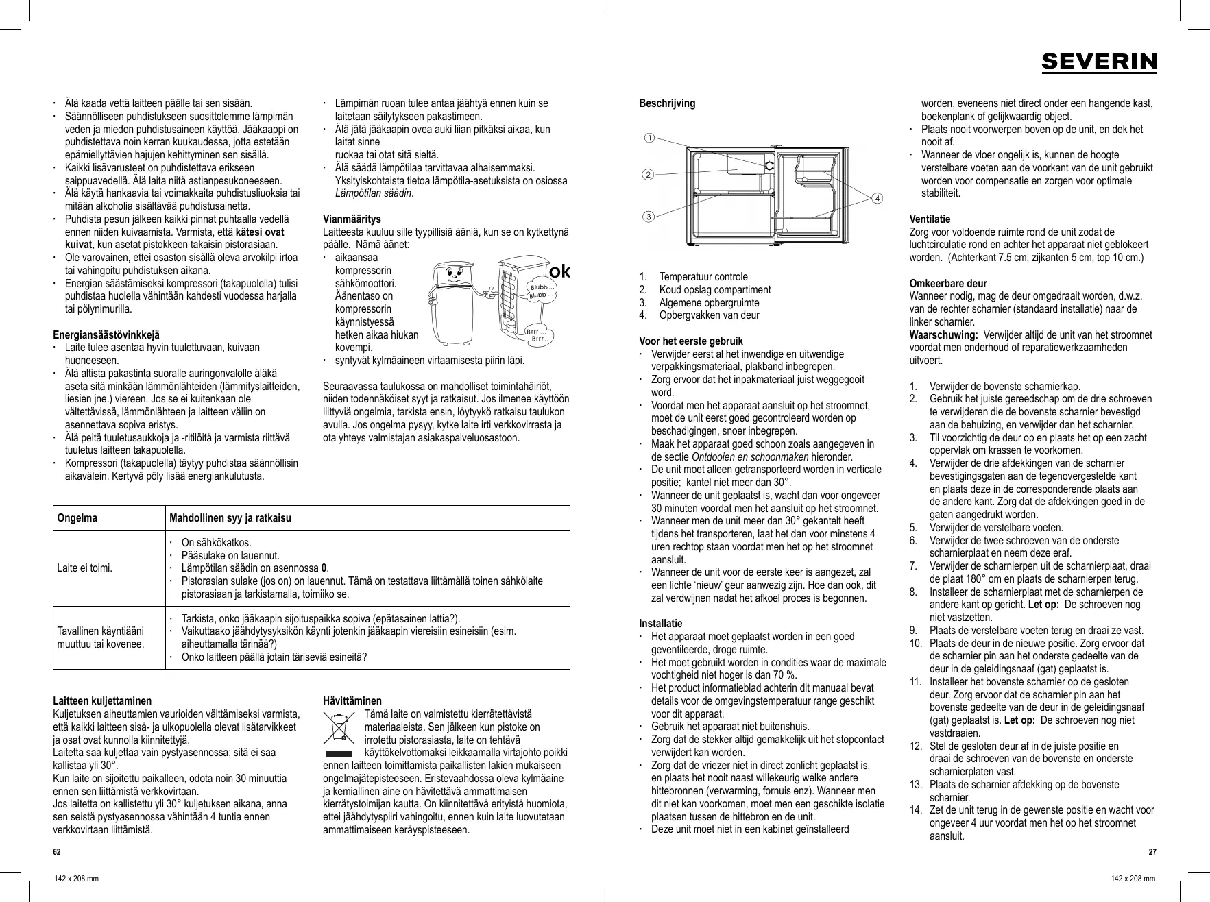 ∙ N’utiliser aucun produit d’entretien abrasif ou surpuissant ni ceux contenant de l’alcool. ∙ Après le nettoyage, essuyez toutes les surfaces à l’eau claire avant de bien les sécher. Lorsque vous rebranchez la fiche à la prise murale, assurez-vous d’avoir les mains sèches. ∙ Pendant le nettoyage, prenez soin de ne pas déplacer ou endommager la plaque signalétique à l’intérieur de la cuve. ∙ Pour économiser de l’énergie, le compresseur (à l’arrière de l’appareil) doit être soigneusement nettoyé au moins deux fois par an avec une brosse ou un aspirateur. Conseils en matière d’économie d’énergie ∙ L’appareil doit être installé dans une pièce sèche et bien aérée. ∙ Ne pas exposer le congélateur au soleil et ne pas le positionner à proximité d’une source de chaleur quelconque (radiateur, cuisinière etc.). Si cela n’est pas possible, mettez en place un dispositif isolant entre la source de chaleur et l’appareil. ∙ Ne pas couvrir les orifices de ventilation et les grilles, et assurez-vous que la circulation d’air à l’arrière de l’appareil soit suffisante. ∙ Le compresseur (à l’arrière) doit être nettoyé régulièrement. L’accumulation de poussière entraine une augmentation de la consommation d’énergie. ∙ Les aliments chauds doivent être refroidis avant d’être rangés à l’intérieur. ∙ Ne pas laisser la porte du réfrigérateur ouverte trop longtemps lors du rangement ou du retrait des aliments. ∙ Ne pas régler la température à un niveau plus bas que nécessaire. Pour des informations détaillées concernant les réglages de température, referez-vous au paragraphe Bouton thermostat. Dépistage des pannes Lors de la mise en marche, certains sons sont audibles. Ces sons sont dus : ∙ au moteur électrique du bloc compresseur; lors de la mise en route du compresseur, le niveau du son reste élevé pendant un certain temps. ∙ au flux de réfrigérant dans le circuit de refroidissement. Le tableau suivant présente les pannes possibles, leurs causes et solutions. En cas de problème de fonctionnement, vérifiez d’abord si la solution figure dans ce tableau. Si le problème persiste, débranchez l’appareil du secteur, puis appelez notre Service Clientèle. 21 142 x 208 mm
