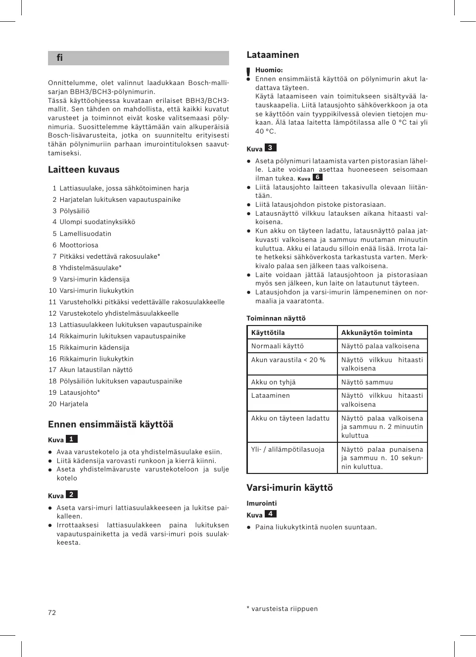Onnittelumme, olet valinnut laadukkaan Bosch-mallisarjan BBH3/BCH3-pölynimurin. Tässä käyttöohjeessa kuvataan erilaiset BBH3/BCH3mallit. Sen tähden on mahdollista, että kaikki kuvatut varusteet ja toiminnot eivät koske valitsemaasi pölynimuria. Suosittelemme käyttämään vain alkuperäisiä Bosch-lisävarusteita, jotka on suunniteltu erityisesti tähän pölynimuriin parhaan imurointituloksen saavuttamiseksi. Laitteen kuvaus 1 Lattiasuulake, jossa sähkötoiminen harja 2 Harjatelan lukituksen vapautuspainike 3 Pölysäiliö 4 Ulompi suodatinyksikkö 5 Lamellisuodatin Lataaminen