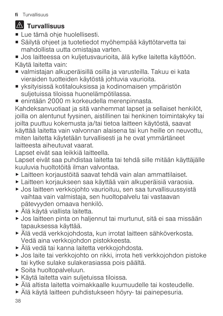 fi Turvallisuus Turvallisuus ¡ Lue tämä ohje huolellisesti. ¡ Säilytä ohjeet ja tuotetiedot myöhempää käyttötarvetta tai mahdollista uutta omistajaa varten. ¡ Jos laitteessa on kuljetusvaurioita, älä kytke laitetta käyttöön. Käytä laitetta vain: ¡ valmistajan alkuperäisillä osilla ja varusteilla. Takuu ei kata vieraiden tuotteiden käytöstä johtuvia vaurioita. ¡ yksityisissä kotitalouksissa ja kodinomaisen ympäristön suljetuissa tiloissa huonelämpötilassa. ¡ enintään 2000 m korkeudella merenpinnasta. Kahdeksanvuotiaat ja sitä vanhemmat lapset ja sellaiset henkilöt, joilla on alentunut fyysinen, aistillinen tai henkinen toimintakyky tai joilta puuttuu kokemusta ja/tai tietoa laitteen käytöstä, saavat käyttää laitetta vain valvonnan alaisena tai kun heille on neuvottu, miten laitetta käytetään turvallisesti ja he ovat ymmärtäneet laitteesta aiheutuvat vaarat. Lapset eivät saa leikkiä laitteella. Lapset eivät saa puhdistaa laitetta tai tehdä sille mitään käyttäjälle kuuluvia huoltotöitä ilman valvontaa. ▶ Laitteen korjaustöitä saavat tehdä vain alan ammattilaiset. ▶ Laitteen korjaukseen saa käyttää vain alkuperäisiä varaosia. ▶ Jos laitteen verkkojohto vaurioituu, sen saa turvallisuussyistä vaihtaa vain valmistaja, sen huoltopalvelu tai vastaavan pätevyyden omaava henkilö. ▶ Älä käytä viallista laitetta. ▶ Jos laitteen pinta on haljennut tai murtunut, sitä ei saa missään tapauksessa käyttää. ▶ Älä vedä verkkojohdosta, kun irrotat laitteen sähköverkosta. Vedä aina verkkojohdon pistokkeesta. ▶ Älä vedä tai kanna laitetta verkkojohdosta. ▶ Jos laite tai verkkojohto on rikki, irrota heti verkkojohdon pistoke tai kytke sulake sulakerasiassa pois päältä. ▶ Soita huoltopalveluun. ▶ Käytä laitetta vain suljetuissa tiloissa. ▶ Älä altista laitetta voimakkaalle kuumuudelle tai kosteudelle. ▶ Älä käytä laitteen puhdistukseen höyry- tai painepesuria.
