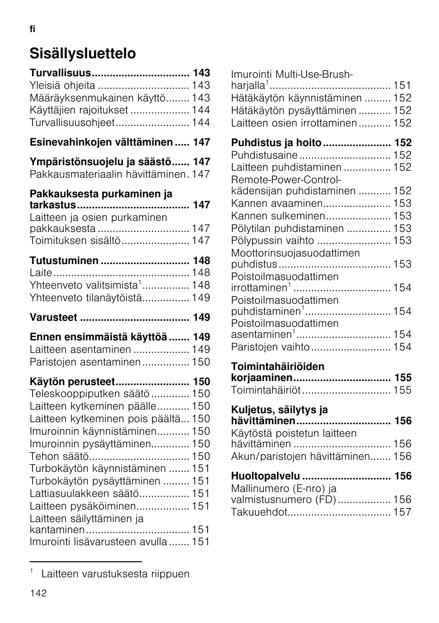 fi Turvallisuus Käyttäjien rajoitukset Kahdeksanvuotiaat ja sitä vanhemmat lapset ja sellaiset henkilöt, joilla on alentunut fyysinen, aistillinen tai henkinen toimintakyky tai joilta puuttuu kokemusta ja/tai tietoa laitteen käytöstä, saavat käyttää laitetta vain valvonnan alaisena tai kun heille on neuvottu, miten laitetta käytetään turvallisesti ja he ovat ymmärtäneet laitteesta aiheutuvat vaarat. Lapset eivät saa leikkiä laitteella. Lapset eivät saa puhdistaa laitetta tai tehdä sille mitään käyttäjälle kuuluvia huoltotöitä ilman valvontaa. Turvallisuusohjeet Noudata näitä turvallisuusohjeita, kun käytät laitetta. VAROITUS ‒ Sähköiskun vaara! ¡ Epäasianmukaiset korjaukset ovat vaarallisia. ▶ Laitteen korjaustöitä saavat tehdä vain alan ammattilaiset. ▶ Laitteen korjaukseen saa käyttää vain alkuperäisiä varaosia. ▶ Jos laitteen verkkojohto vaurioituu, sen saa turvallisuussyistä vaihtaa vain valmistaja, sen huoltopalvelu tai vastaavan pätevyyden omaava henkilö. ¡ Viallinen laite tai verkkojohto on vaarallinen. ▶ Älä käytä viallista laitetta. ▶ Jos laitteen pinta on haljennut tai murtunut, sitä ei saa missään tapauksessa käyttää. ▶ Älä vedä verkkojohdosta, kun irrotat laitteen sähköverkosta. Vedä aina verkkojohdon pistokkeesta. ▶ Älä vedä tai kanna laitetta verkkojohdosta. ▶ Jos laite tai verkkojohto on rikki, irrota heti verkkojohdon pistoke tai kytke sulake sulakerasiassa pois päältä. ▶ "Soita huoltopalveluun." → Sivu 156 ▶ Laitteen korjaustöitä saavat tehdä vain alan ammattilaiset. ¡ Laitteeseen pääsevä kosteus voi aiheuttaa sähköiskun. ▶ Käytä laitetta vain suljetuissa tiloissa. ▶ Älä altista laitetta voimakkaalle kuumuudelle tai kosteudelle. ▶ Älä käytä laitteen puhdistukseen höyry- tai painepesuria.