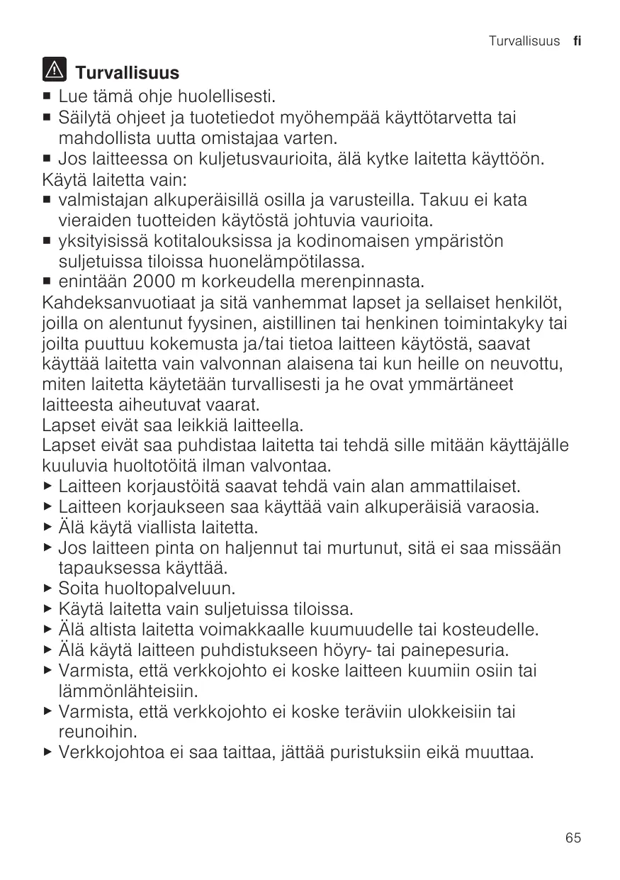 Kahdeksanvuotiaat ja sitä vanhemmat lapset ja sellaiset henkilöt, joilla on alentunut fyysinen, aistillinen tai henkinen toimintakyky tai joilta puuttuu kokemusta ja/tai tietao laitteen käytöstä, saavat käytää laitetta vain valvonnan alaisena tai kun heille on neuvottu, miten laitetta käytetään turvallisesti ja he ovat ymmärtneet laitteesta aiheutuvat vaarat.