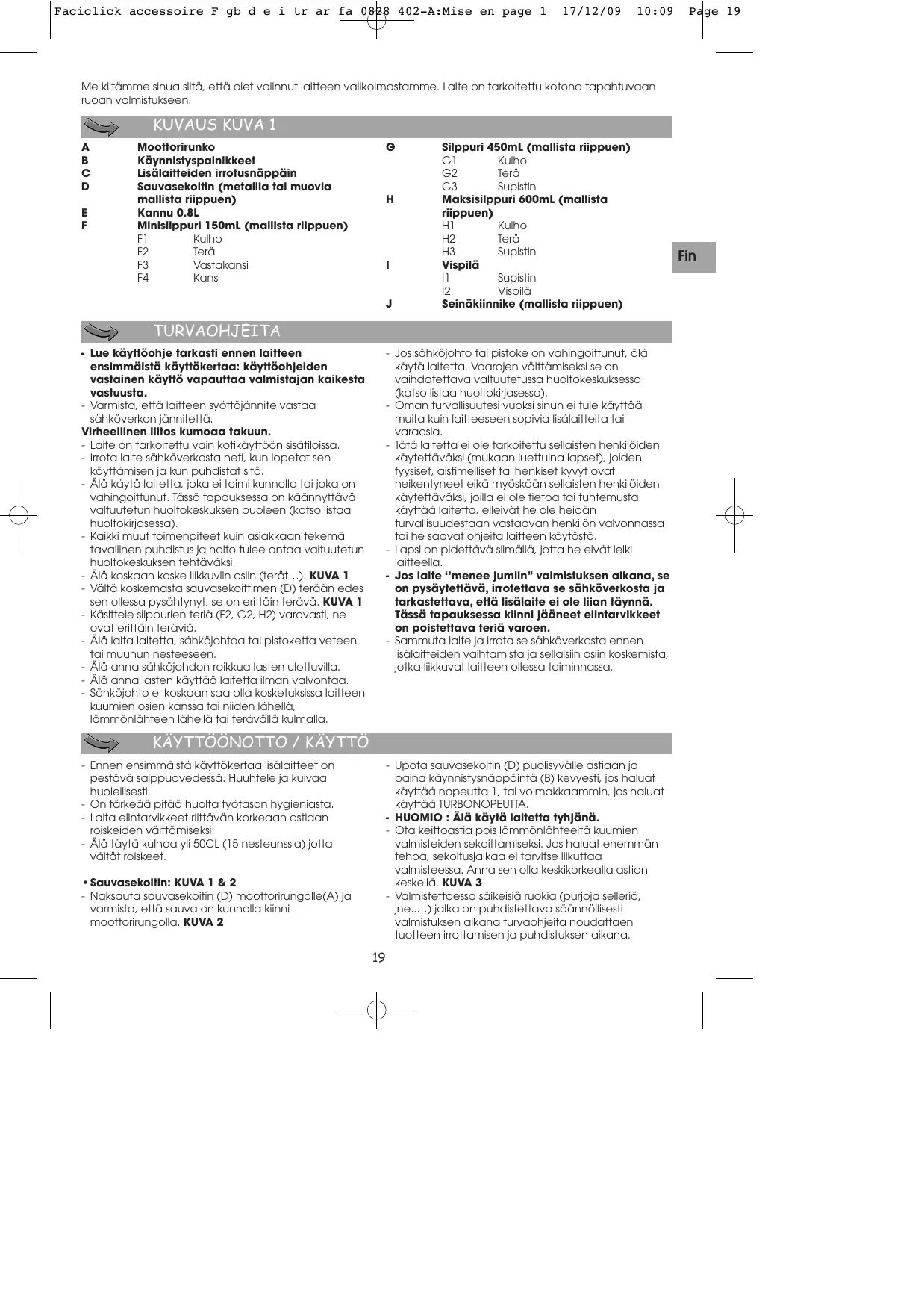 Page 18 Faciclick accessoire F gb d e i tr ar fa 0828 402-A:Mise en page 1 17/12/09 10:09 Page 19 Me kiitämme sinua siitä, että olet valinnut laitteen valikoimastamme. Laite on tarkoitettu kotona tapahtuvaan ruoan valmistukseen. KUVAUS KUVA 1
