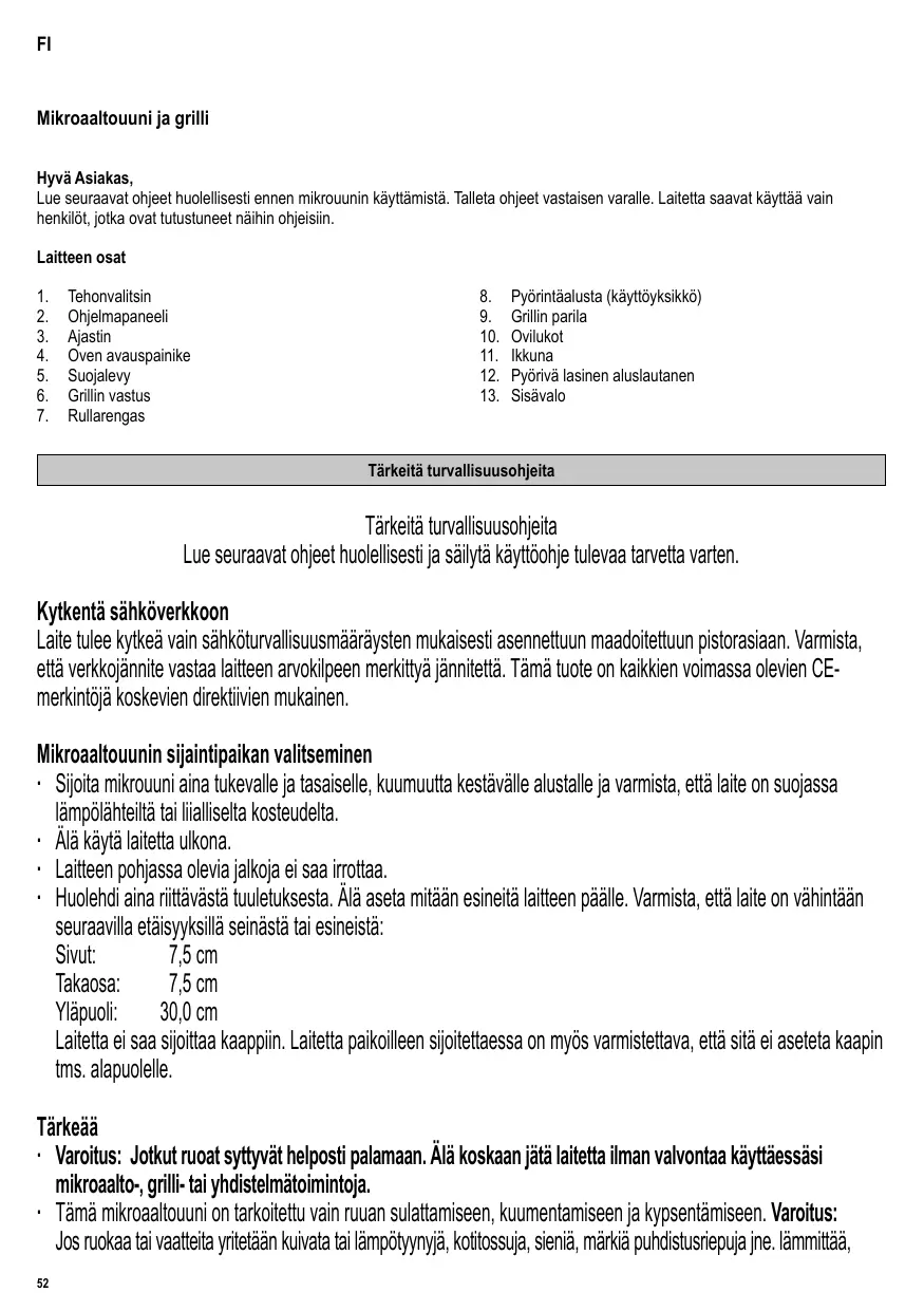 9. Branchement au secteur L’appareil doit être branché exclusivement sur une prise de courant avec terre, installée selon les normes en vigueur. Assurez-vous que la tension d’alimentation correspond à la tension indiquée sur la plaque signalétique de l’appareil. Ce produit est conforme aux directives obligatoires inhérentes au marquage CE. Positionnement de l’appareil ∙ Installez toujours le four à micro-ondes sur une surface stable et plane, résistante à la chaleur et à l’abri de toute source de chaleur ou d’humidité excessive. ∙ Ne pas utiliser l’appareil en plein air. ∙ Les pieds de l’appareil ne doivent pas être enlevés. ∙ Assurez une ventilation suffisante et constante. Ne placez aucun objet sur l’appareil et veillez à ce que les distances minimales suivantes soient respectées entre l’appareil et le mur ou tout autre objet : Côtés: 7,5 cm A l’arrière: Le séchage d’aliments, de vêtements ainsi que le chauffage de coussins chauffants, de chaussons, d’éponges, de 16