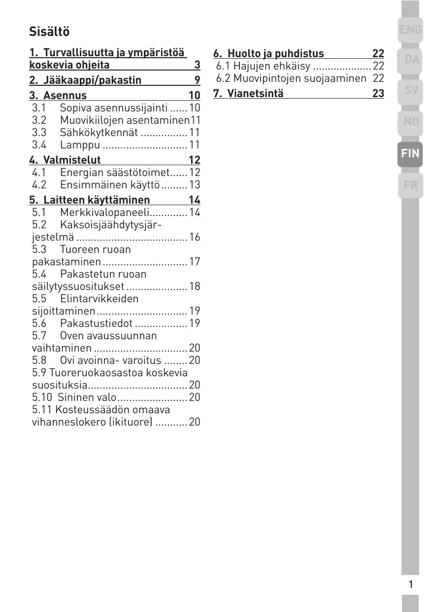 Sisältö 1. Turvallisuutta ja ympäristöä koskevia ohjeita 3 2. Jääkaappi/pakastin 9 3. Asennus 10 3.1 Sopiva asennussijainti10 3.2 Muovikiilojen asentaminen.11 3.3 Sähkökytkennät11 3.4 Lamppu11 4. Valmistelut 12 4.1 Energian säästötoimet12 4.2 Ensimmäinen käyttö13 5. Laitteen käyttäminen 14 5.1 Merkkivalopaneeli14 5.2 Kaksoisjäähdytysjärjestelmä16 5.3 Tuoreen ruoan pakastaminen17 5.4 Pakastetun ruoan säilytyssuositukset18 5.5 Elintarvikkeiden sijoittaminen19 5.6 Pakastustiedot19 5.7 Oven avaussuunnan vaihtaminen20 5.8 Ovi avoinna- varoitus20 5.9 Tuoreruokaosastoa koskevia suosituksia20 5.10 Sininen valo20 5.11 Kosteussäädön omaava vihanneslokero (ikituore)20