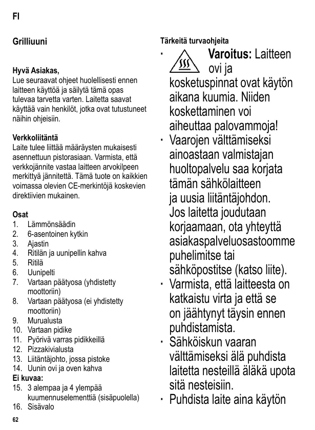 Hyvä Asiakas, Lue seuraavat ohjeet huolellisesti ennen laitteen käyttöä ja säilytä tämä opas tulevaa tarvetta varten. Laitetta saavat käyttää vain henkilöt, jotka ovat tutustuneet näihin ohjeisiin. Verkkoliitäntä Laite tulee liittää määräysten mukaisesti asennettuun pistorasiaan. Varmista, että verkkojännite vastaa laitteen arvokilpeen merkittyä jännitettä. Tämä tuote on kaikkien voimassa olevien CE-merkintöjä koskevien direktiivien mukainen. Osat 1. Lämmönsäädin 2. 6-asentoinen kytkin 3. Ajastin 4. Ritilän ja uunipellin kahva 5. Ritilä 6. Uunipelti 7. Vartaan päätyosa (yhdistetty moottoriin) 8. Vartaan päätyosa (ei yhdistetty moottoriin) 9. Murualusta 10. Vartaan pidike 11. Pyörivä varras pidikkeillä 12. Pizzakivialusta 13. Liitäntäjohto, jossa pistoke 14. Uunin ovi ja oven kahva Ei kuvaa: 15. 3 alempaa ja 4 ylempää kuumennuselementtiä (sisäpuolella) 16. Sisävalo 62