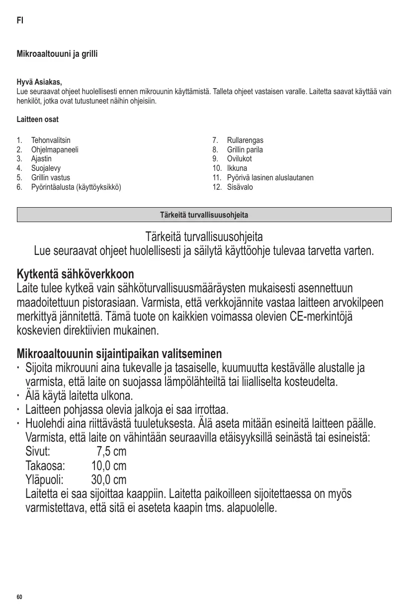Lisez attentivement les instructions ci-après et conservez ce manuel d’instructions pour toute référence ultérieure. Branchement au secteur L’appareil doit être branché exclusivement sur une prise de courant avec terre, installée selon les normes en vigueur. Assurez-vous que la tension d’alimentation correspond à la tension indiquée sur la plaque signalétique de l’appareil. Ce produit est conforme aux directives obligatoires inhérentes au marquage CE. Positionnement de l’appareil ∙ Installez toujours le four à micro-ondes sur une surface stable et plane, résistante à la chaleur et à l’abri de toute source de chaleur ou d’humidité excessive. ∙ Ne pas utiliser l’appareil en plein air. ∙ Les pieds de l’appareil ne doivent pas être enlevés. ∙ Assurez une ventilation suffisante et constante. Ne placez aucun objet sur l’appareil et veillez à ce que les distances minimales suivantes soient respectées entre l’appareil et le mur ou tout autre objet : Côtés: 7,5 cm A l’arrière: ∙ Utilisez uniquement des ustensiles adaptés à la cuisson au four micro-ondes. Ne pas utiliser de récipients en métal lors du réchauffage d’aliments ou de boissons pour la fonction cuisson aux micro-ondes. Pour des informations plus détaillées, veuillez vous référer au paragraphe Utilisez toujours des ustensiles de cuisine appropriés. ∙ L’appareil n’est pas destiné à être utilisé avec un programmateur externe ou une télécommande indépendante. ∙ Cet appareil peut être utilisé par des enfants (à partir de 8 ans) et par des personnes souffrant de déficiences physiques, sensorielles ou mentales, ou manquant d’expérience ou de connaissances, s’ils ont été formés à l’utilisation de l’appareil et ont été supervisés, et s’ils en comprennent les dangers et les précautions de sécurité à prendre. ∙ Les enfants ne sont pas autorisés à jouer avec l’appareil. ∙ Les enfants ne doivent pas être autorisés à nettoyer ou à entreprendre des travaux de maintenance sur l’appareil à moins d’être supervisés. ∙ L’appareil et son cordon d’alimentation doivent être, à tout moment, tenus hors de portée des enfants de moins de 8 ans. ∙ Pour éviter le risque de chocs électriques, ne pas nettoyer l’appareil avec du liquide et ne pas le plonger dans du liquide. ∙ Avertissement : En raison des très hautes températures utilisées par les fonctions combinées, cet appareil ne doit pas être utilisé par les enfants sans la surveillance d’un adulte. ∙ Lors de l’utilisation des fonctions gril ou combinées, prenez soin de ne pas toucher la résistance interne. ∙ L’emploi d’appareils de nettoyage à la vapeur pour nettoyer ce four est interdit. ∙ Éteignez toujours l’appareil et débranchez la fiche de la prise de courant: - avant tout nettoyage, - en cas de fonctionnement défectueux.