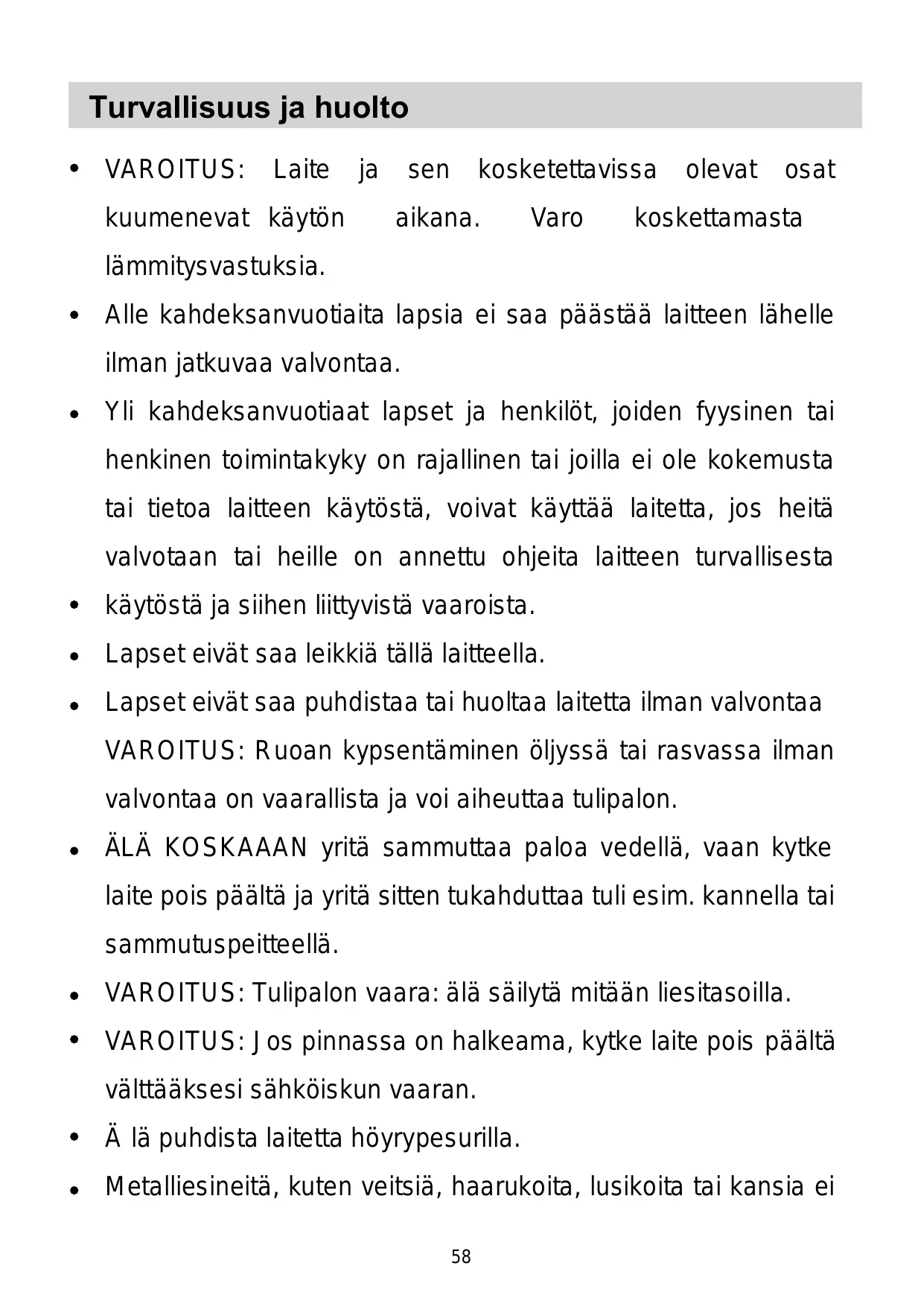 sen kosketettavissa aikana. Varo olevat osat koskettamasta lämmitysvastuksia. Alle kahdeksanvuotiaita lapsia ei saa päästää laitteen lähelle ilman jatkuvaa valvontaa. Yli kahdeksanvuotiaat lapset ja henkilöt, joiden fyysinen tai henkinen toimintakyky on rajallinen tai joilla ei ole kokemusta tai tietoa laitteen käytöstä, voivat käyttää laitetta, jos heitä valvotaan tai heille on annettu ohjeita laitteen turvallisesta käytöstä ja siihen liittyvistä vaaroista. Lapset eivät saa leikkiä tällä laitteella. Lapset eivät saa puhdistaa tai huoltaa laitetta ilman valvontaa VAROITUS: Ruoan kypsentäminen öljyssä tai rasvassa ilman valvontaa on vaarallista ja voi aiheuttaa tulipalon. ÄLÄ KOSKAAAN yritä sammuttaa paloa vedellä, vaan kytke laite pois päältä ja yritä sitten tukahduttaa tuli esim. kannella tai sammutuspeitteellä. VAROITUS: Tulipalon vaara: älä säilytä mitään liesitasoilla. VAROITUS: Jos pinnassa on halkeama, kytke laite pois päältä välttääksesi sähköiskun vaaran. Ä lä puhdista laitetta höyrypesurilla. Metalliesineitä, kuten veitsiä, haarukoita, lusikoita tai kansia ei