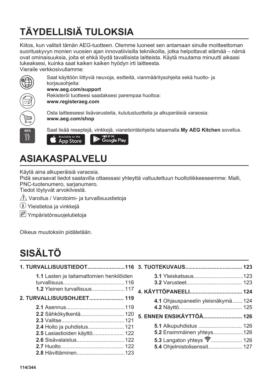 Enregistrer votre produit pour un meilleur service : www.registeraeg.com Acheter des accessoires, consommables et pièces de rechange d’origine pour votre appareil : www.aeg.com/shop Pour plus de recettes, conseils, informations de dépannage, téléchargez l’application My AEG Kitchen.