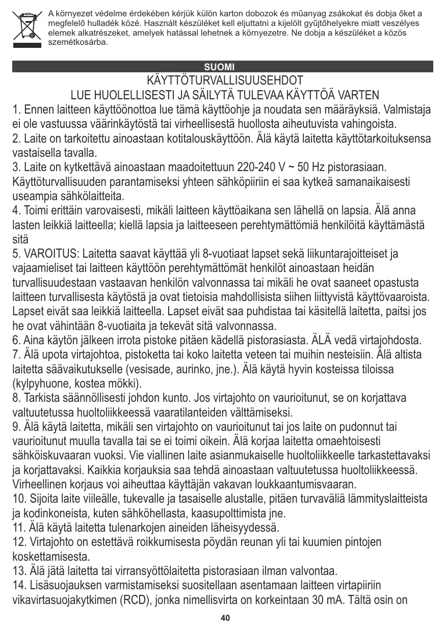 Kun espressokeittimelle on tehty kalkinpoisto, se tulee huuhdella kolme kertaa puhtaalla vedellä. Sitä varten täytä vesisäiliö (4) puhtaalla vedellä ja toista toimenpiteet 1 – 7. TEKNISET TIEDOT: Kapasiteetti max: 1.0l Jännite: 220-240V ~ 50Hz Teho: 850W Laite kuuluu I-luokan eritysluokkaan ja vaatii maadoitetun pistorasian. Laite on EU-direktiivien mukainen: - Matalan jännitteen direktiivi (Low voltage directive: LVD) - Sähkömagneettinen yhteensopivuus (Electromagnetic compatibility: EMC) Laite on merkitty CE-merkinnällä Suojellaksesi ympräristöäsi: hävitä pahvilaatikot ja muovipussit ja kierrätä ne niille tarkoitetuissa jäteastioissa. Käytetyt koneet tulee toimittaa niihin erioistuneisiin keräyspisteisiin ympäristölle vaarallisten aineiden takia. Älä hävitä laitteita sekajätteessä.