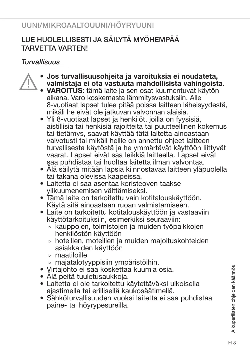 - Jos säätimet on puhdistusta varten asetettava normaalia ruoanlaittoa suuremmalle asetukselle (pyrolyyttinen puhdistus), pinnat saattavat kuumeta normaalia kuumemmiksi ja lapset on pidettävä etäällä laitteesta. FI 4