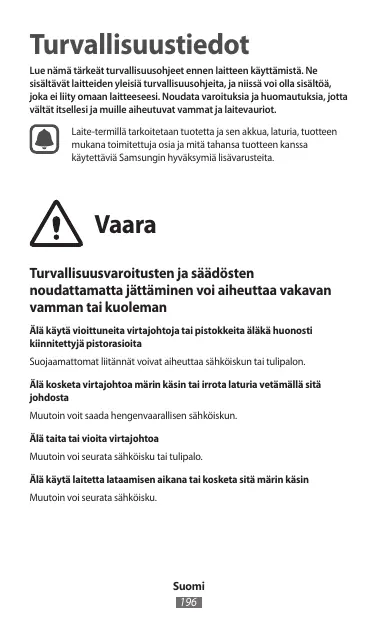 • Évitez d’exposer l’appareil et la batterie à des températures très basses ou très élevées. • Ne soumettez pas l’appareil à des températures extrêmes, car cela peut l’endommager ou réduire la capacité de chargement et la durée de vie de l’appareil et de la batterie. • Évitez que la batterie entrent en contact avec des objets métalliques, car cela risquerait de provoquer un court-circuit entre les bornes + et – de la batterie et de l’endommager de manière temporaire ou permanente. • N’utilisez jamais une batterie ou un chargeur endommagé(e). Ne conservez pas votre appareil à proximité ou à l’intérieur de radiateurs, de fours à micro-ondes, d’équipements de cuisine chauffants ou de conteneurs à haute pression • La batterie peut fuir. • Votre appareil peut surchauffer et causer un incendie. Cet appareil ne doit pas être utilisé ou stocké dans des zones où règne une forte concentration en poussières ou microparticules en suspension La poussière ou les microparticules peuvent provoquer des dysfonctionnements de l’appareil et entraîner des incendies ou des décharges électriques. Le connecteur à fonctions multiples et la petite extrémité du chargeur ne doivent jamais entrer en contact avec des matériaux conducteurs, tels que liquides, poussière, poudres métalliques et mines de crayon Les matériaux conducteurs peuvent provoquer un court-circuit ou corroder les bornes et entraîner une explosion ou un incendie. Ne mordez et ne portez pas à la bouche l’appareil ou la batterie • Vous risquez d’endommager l’appareil ou de provoquer une explosion ou un incendie. • Surveillez les enfants ou les animaux qui pourraient s’étrangler avec des pièces de dimension réduite. • Assurez-vous que les enfants manipulent l’appareil de façon appropriée s’ils doivent l’utiliser.